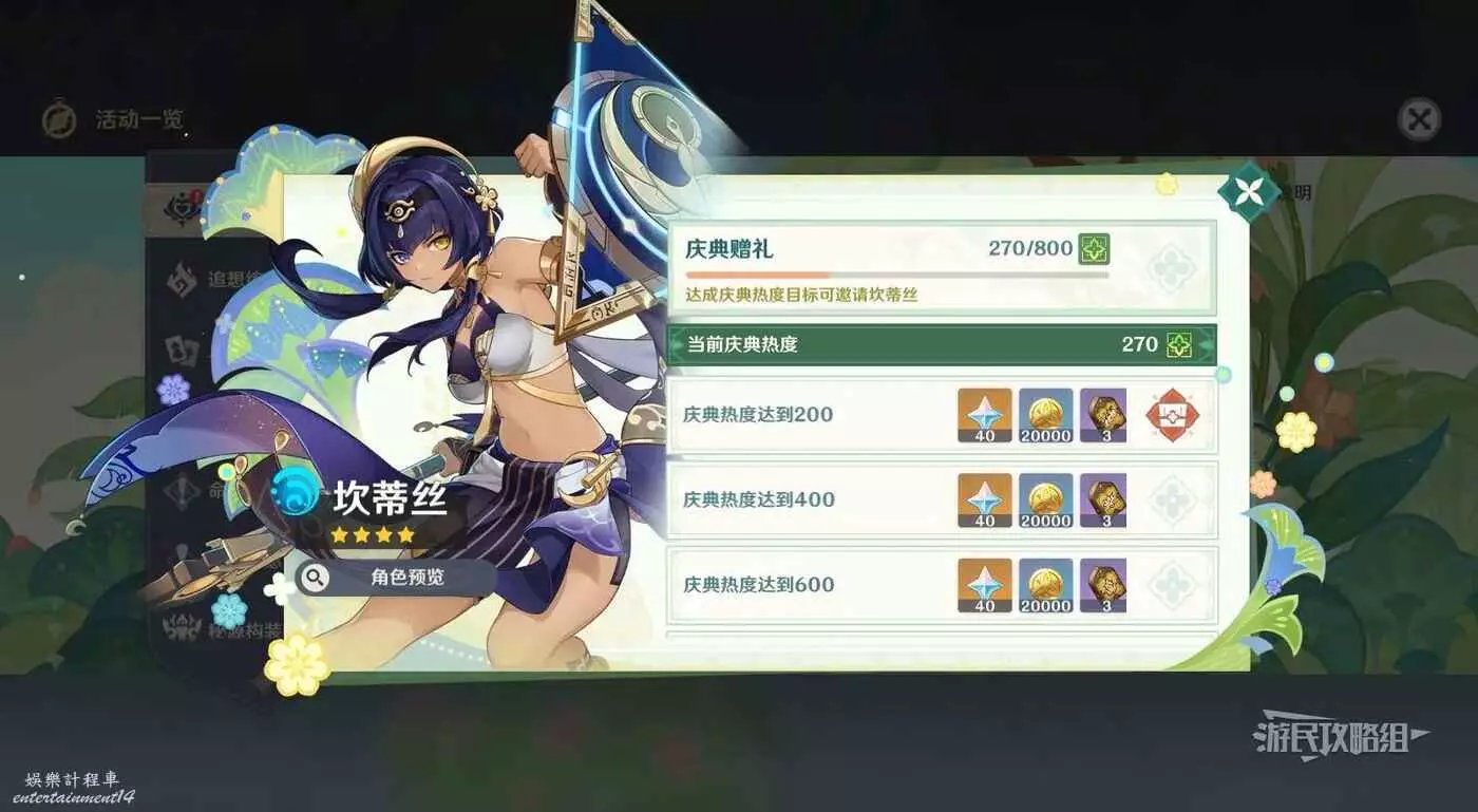 通過完成活動關卡和活動任務獲得慶典贈禮,當慶典贈禮達到800時即可在活動介面領取坎蒂絲。