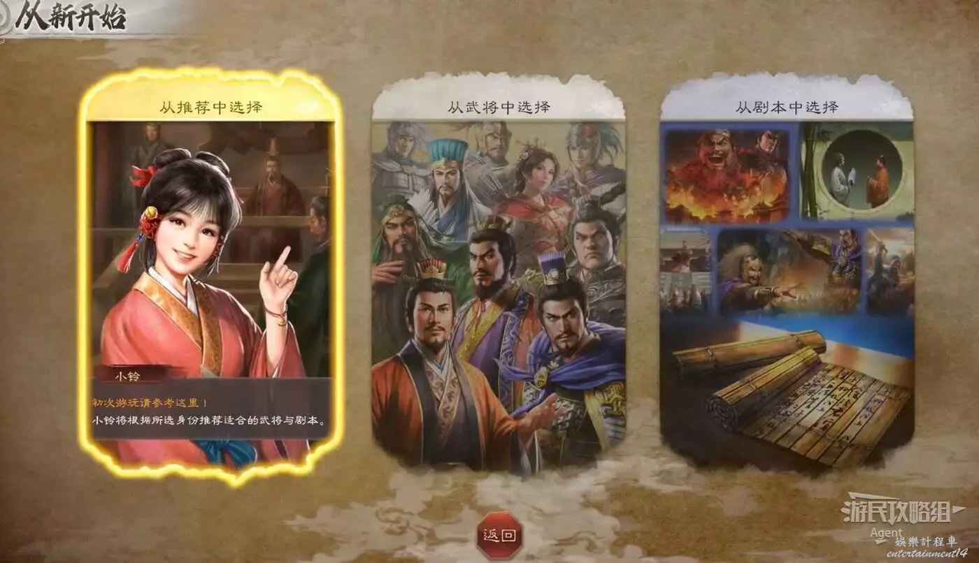 開始新遊戲時,如果你不熟悉三國志和武將背景,就選擇第一項“從推薦中選擇”,會根據不同身份為你推薦適合的武將。