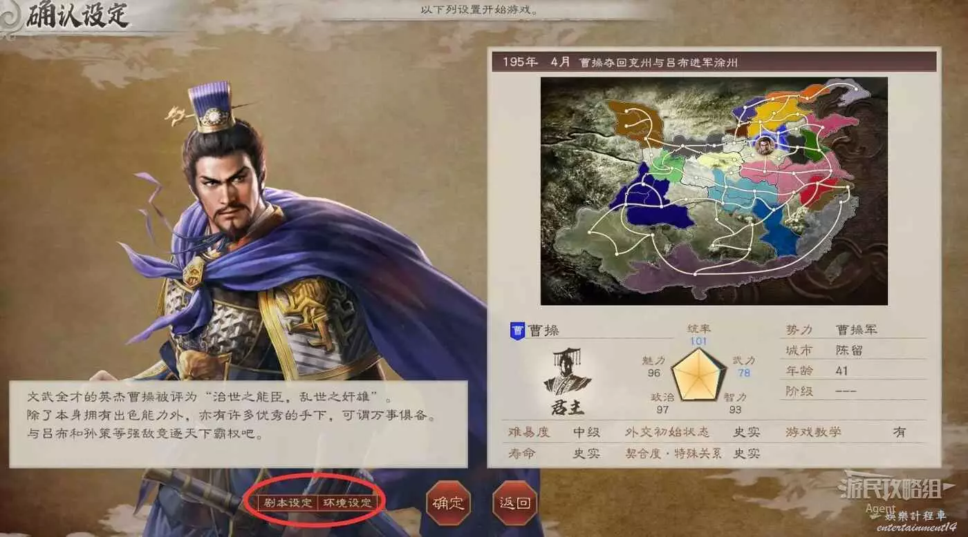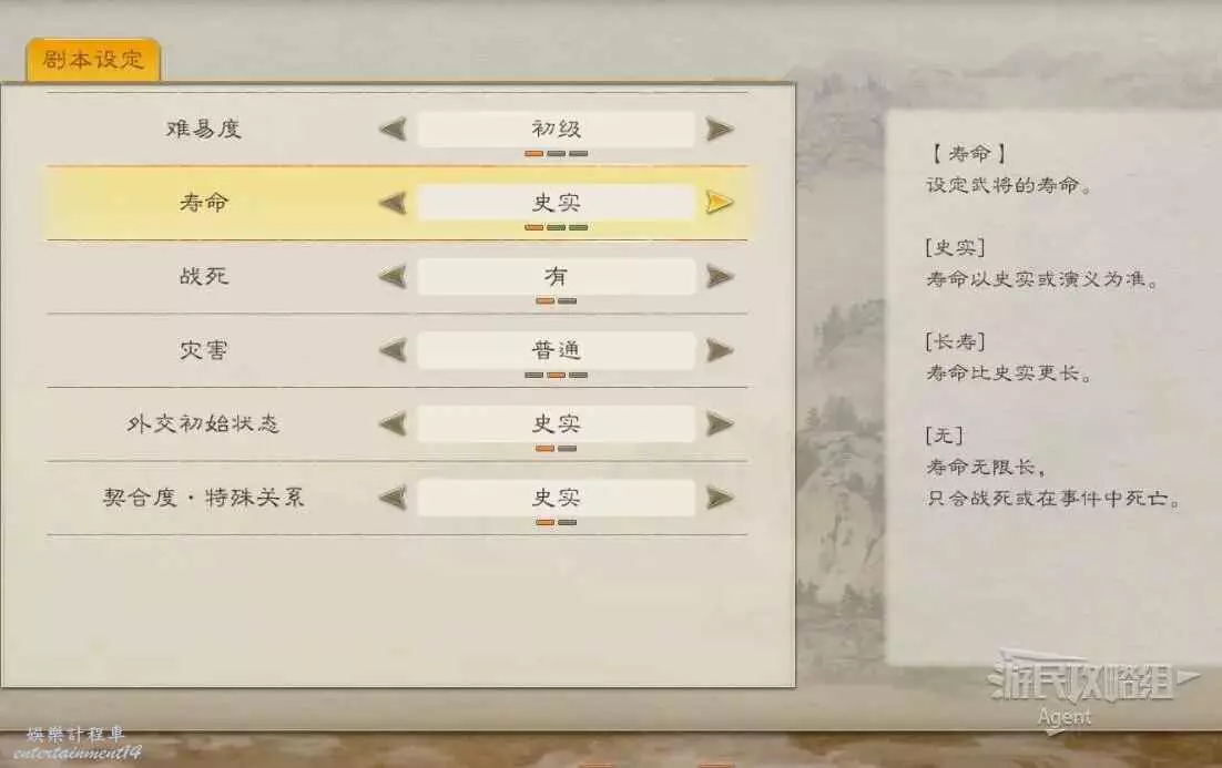 劇本設定包括遊戲難度、武將壽命、武將是否會在戰鬥中死亡、災害發生的頻率等。喜歡歷史沉浸感的就都選“史實”,不在意是否符合歷史的話,最好把武將壽命調長一些,不然玩著玩著哪天突然人沒了會很痛惜。