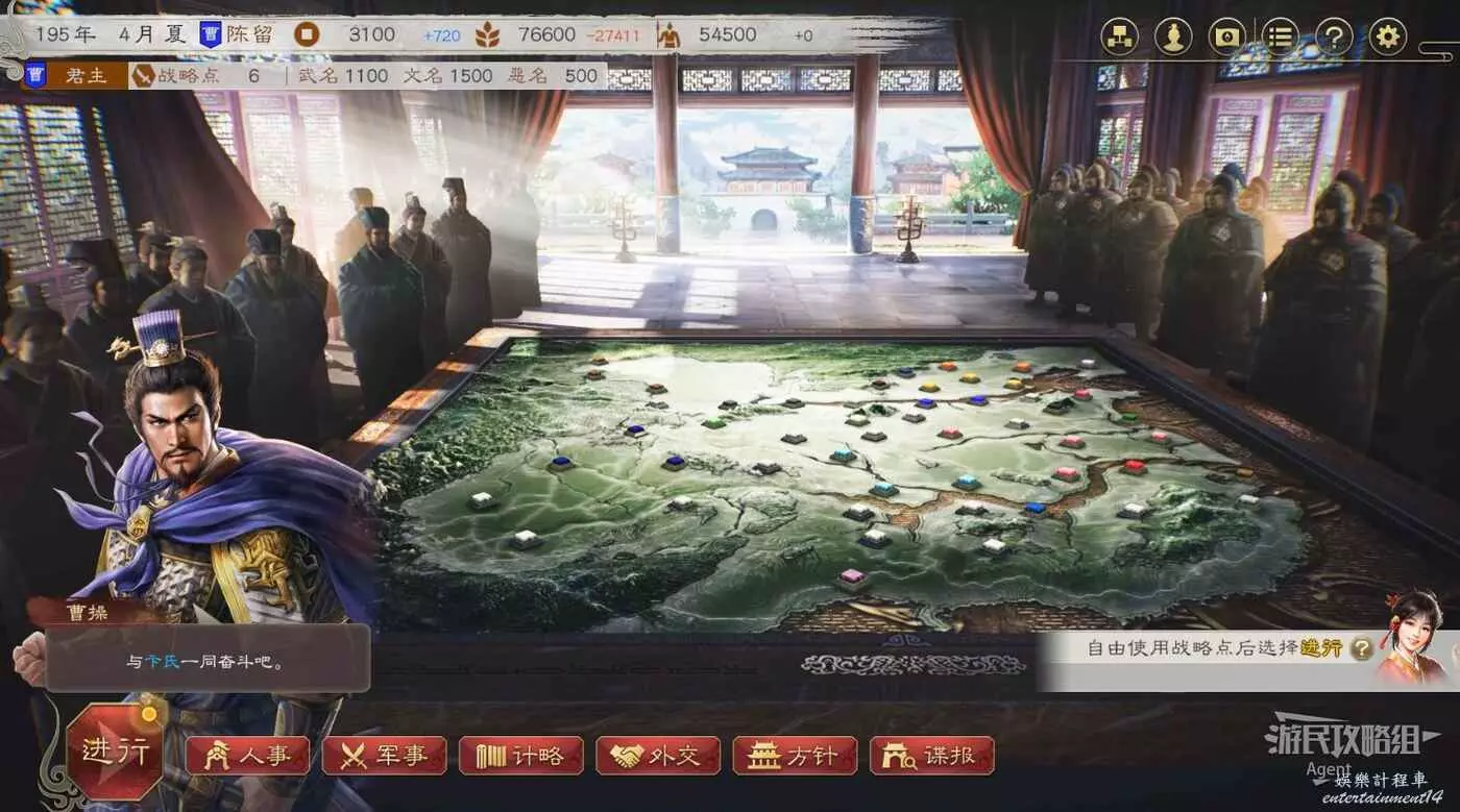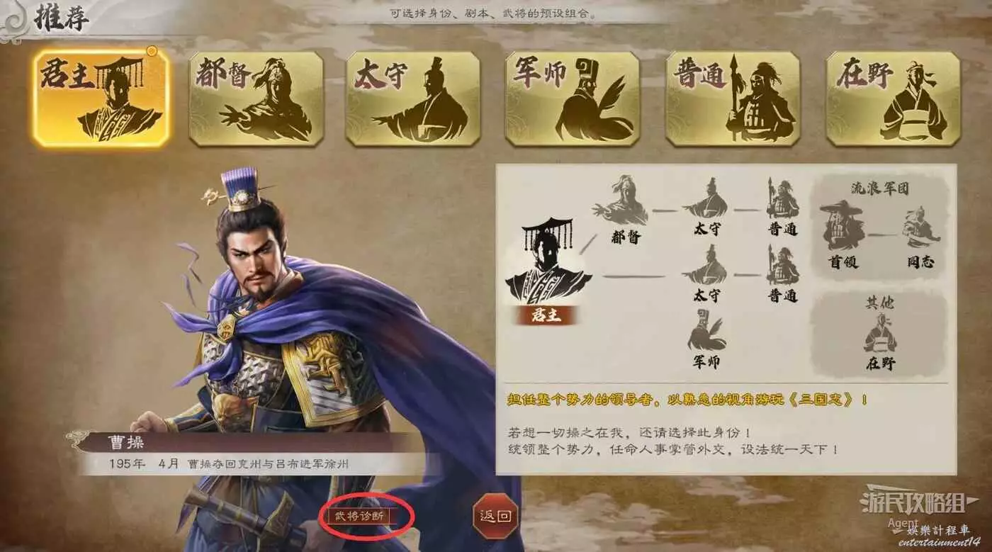 君主(曹操):擔任整個勢力的領導者,是遊玩《三國志》最熟悉的視角,如果想一切操之在我,統領整個勢力,任命人事掌管外交,設法統一天下,請選擇君主身份。