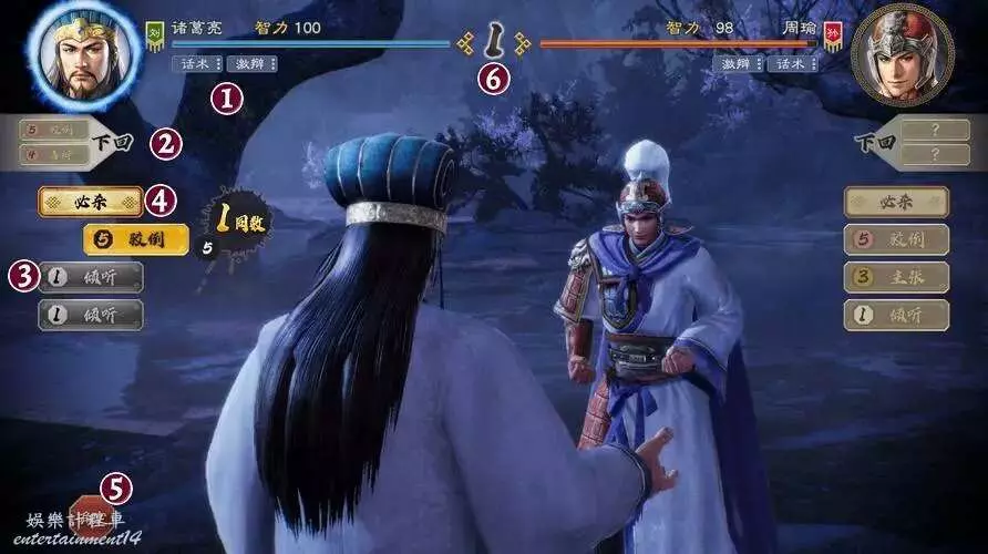 舌戰開始時,智力較高的武將能先發制人,給予對手一擊。之後才會展開卡牌對決。