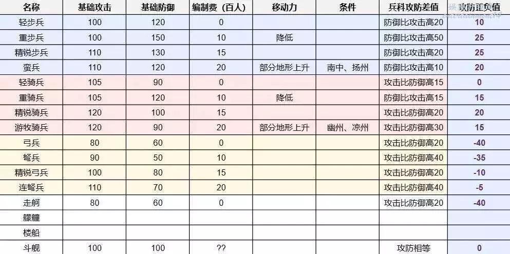 部隊攻擊/防禦=兵科基礎攻擊/防禦+兵力/5000*【部隊統率】+特殊加成(奇才/特技等)