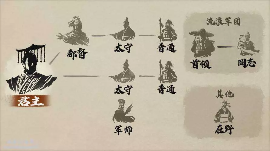 | 君主 | 統領勢力的身份。 可執行外交同盟等戰略,決定勢力整體走向。 可根據自身判斷執行大部分指令。 |