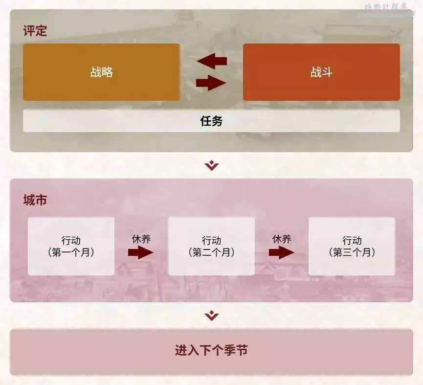 每三個月季節會發生更迭。在每個季節伊始時將召開評定(勢力行動的機會)。若在評定中決定出陣,則會在軍議結束後開始戰鬥。