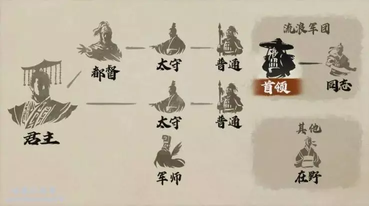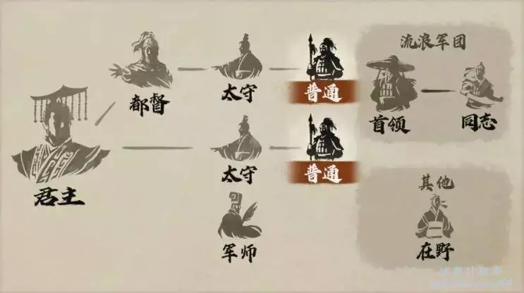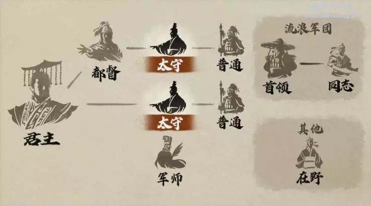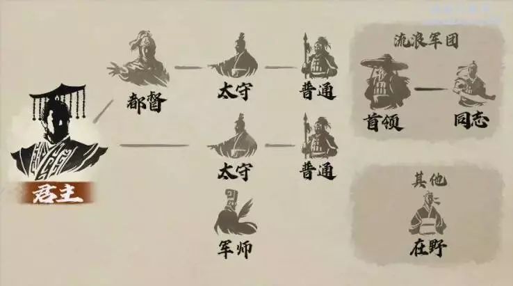 每個“勢力”都有各自的君主,統治旗下的城市。其部下則可分為都督、軍師、太守和普通等身份。