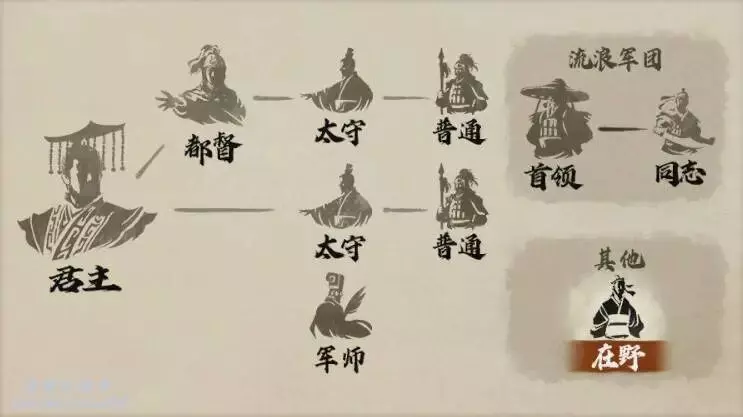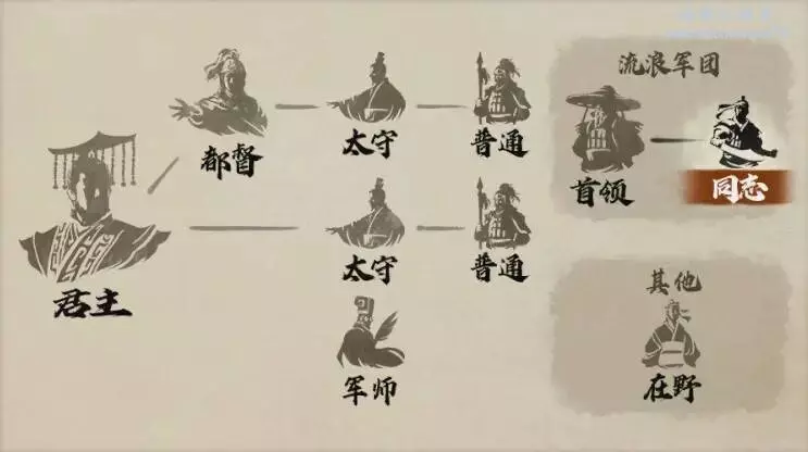 身份分為君主/都督/太守/軍師/普通/首領/同志/在野八種。