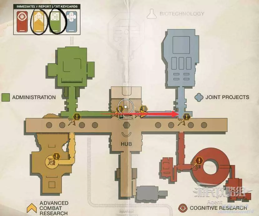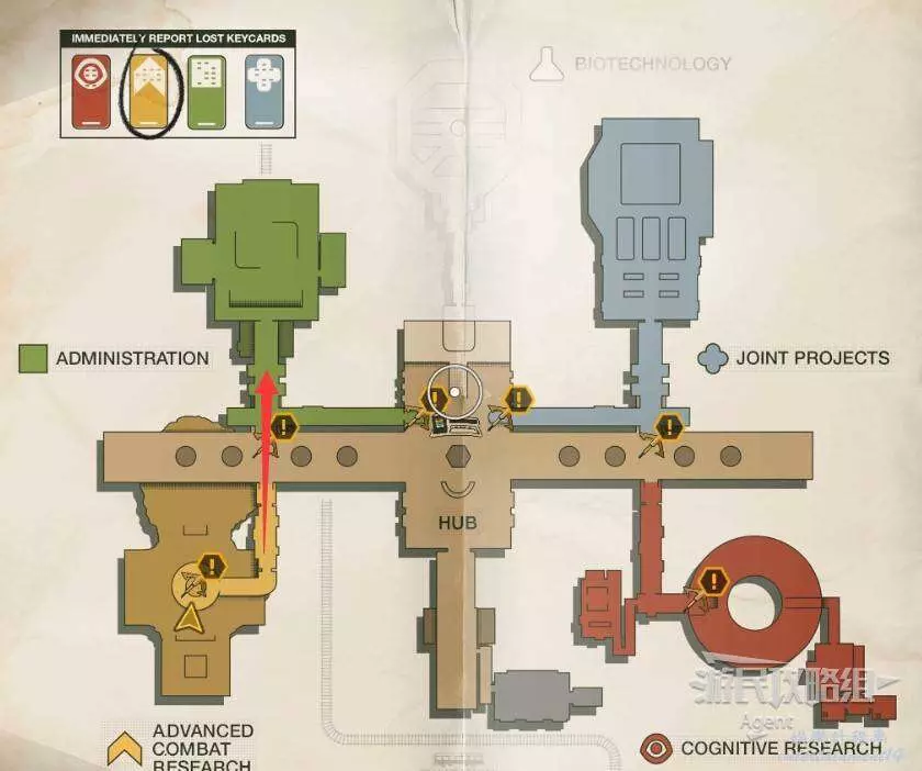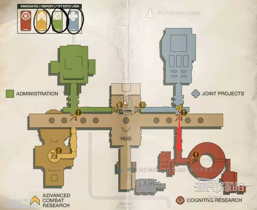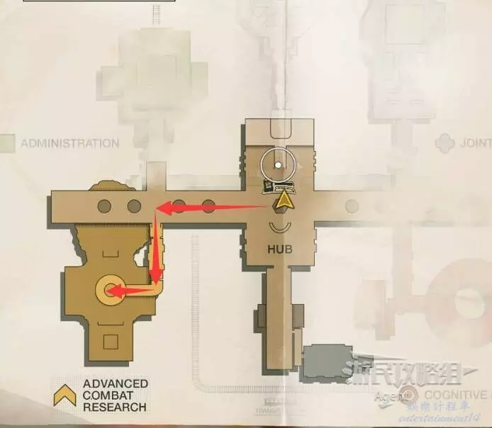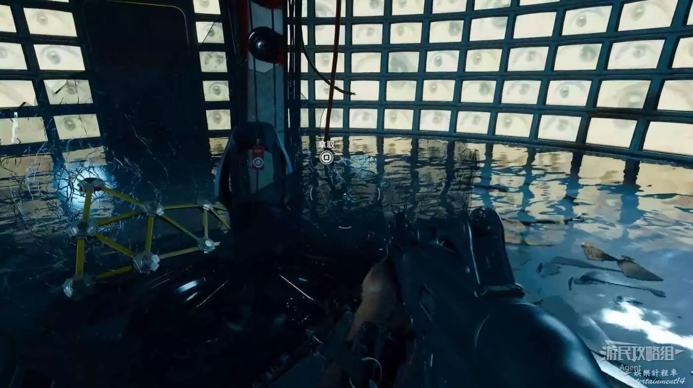 回到走廊上,用抓鉤上去來到綠色區域(行政處)。