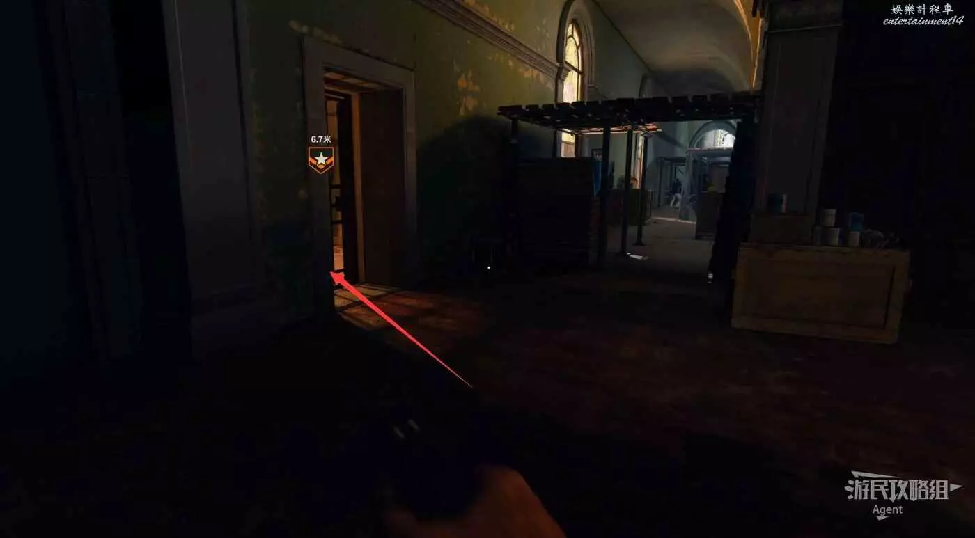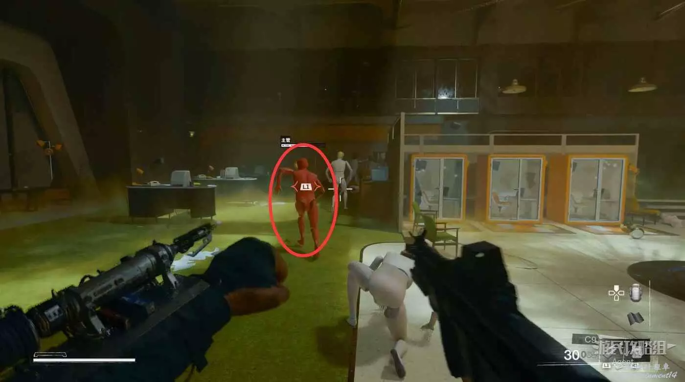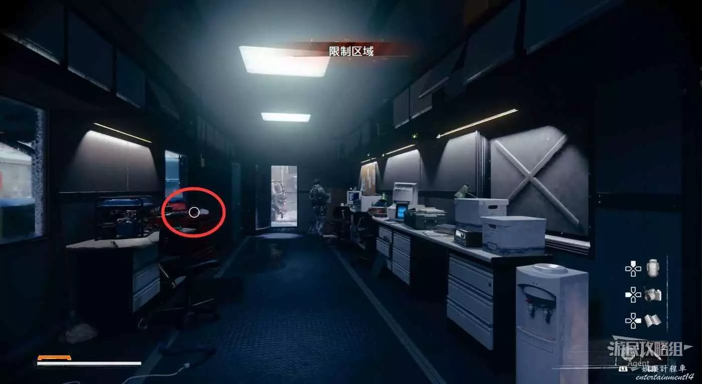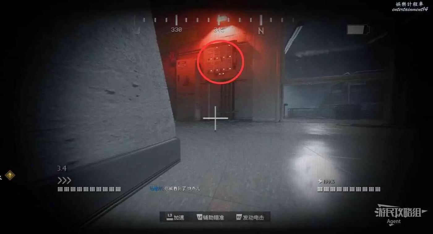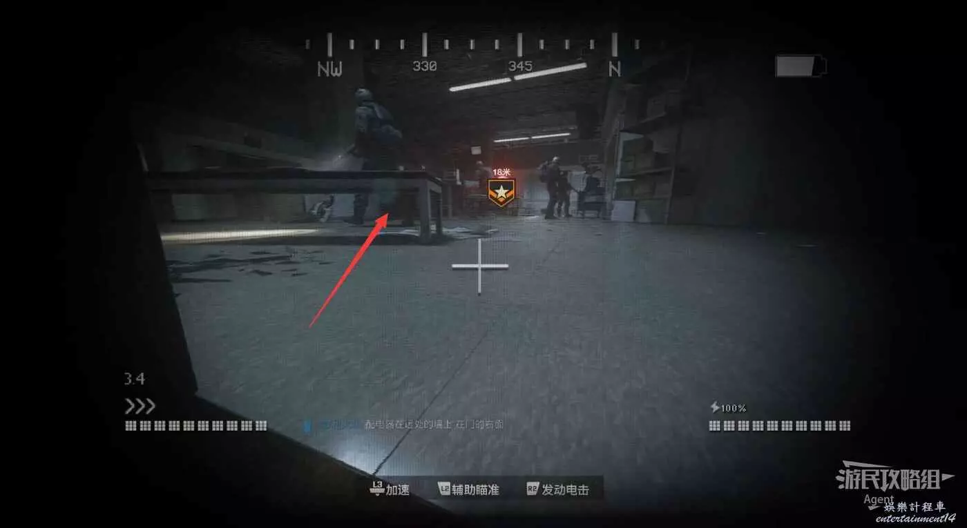 屋裡有很多敵人,躲到桌子底下,偷偷過去。如果中途被發現也不用慌,迅速沖過去炸掉配電器就行。