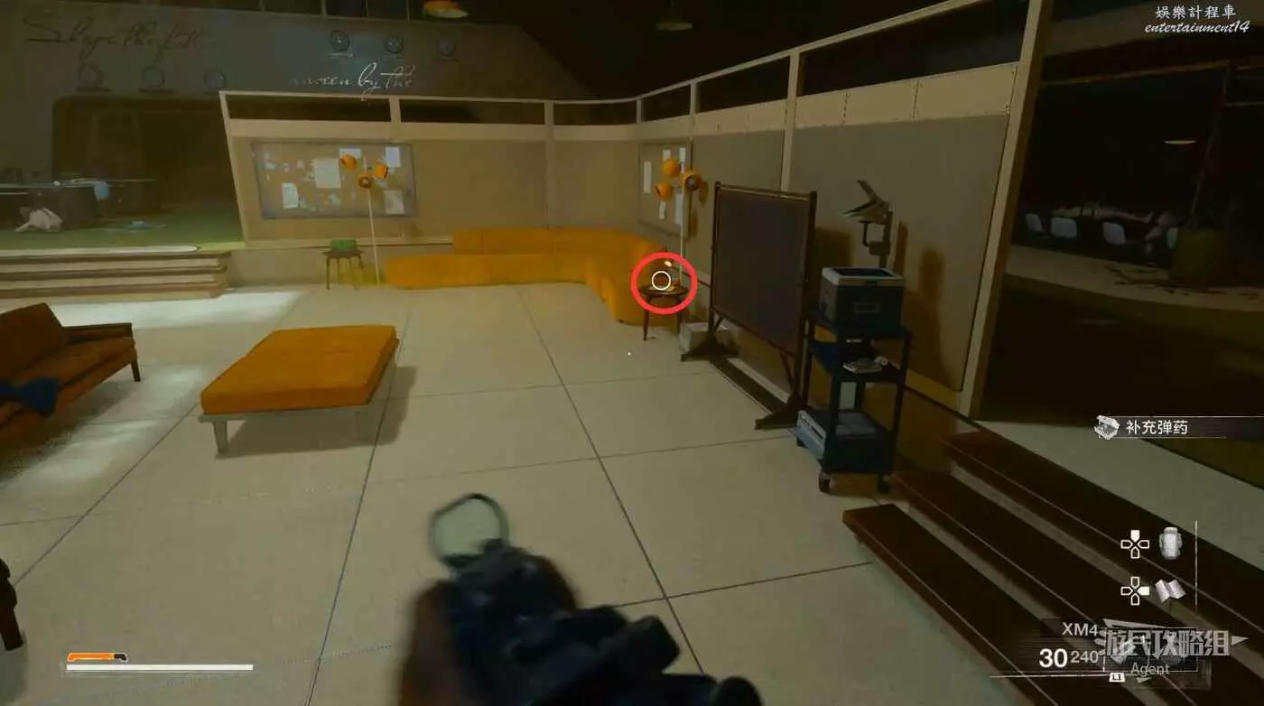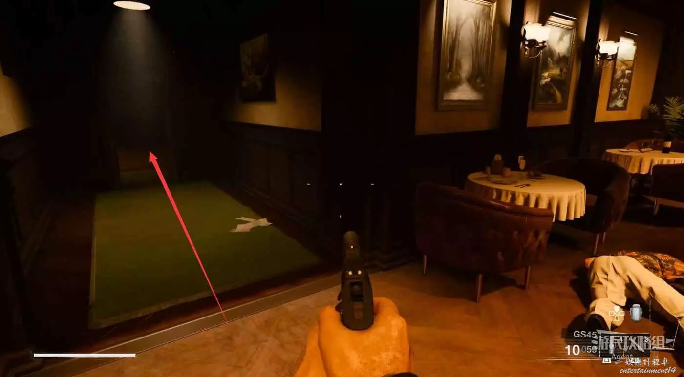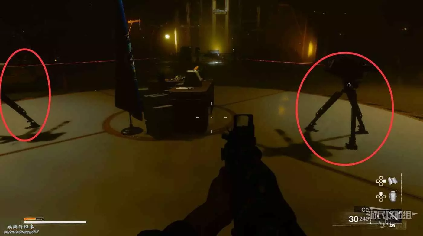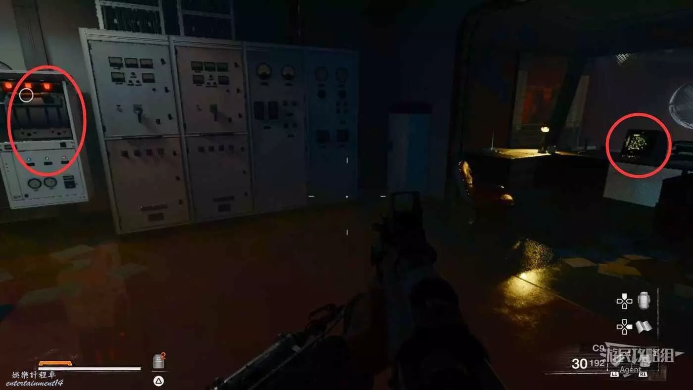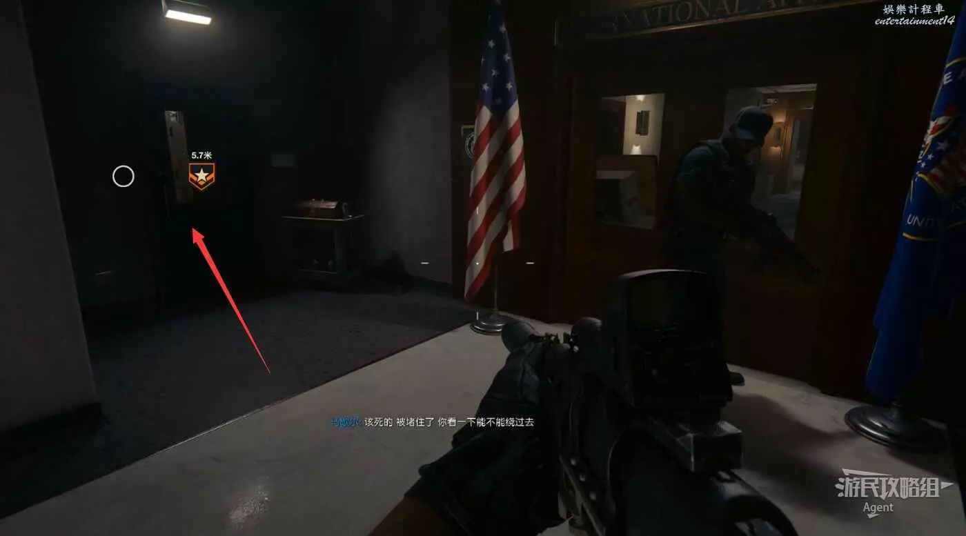 屋裡有很多敵人,躲到桌子底下,偷偷過去。如果中途被發現也不用慌,迅速沖過去炸掉配電器就行。