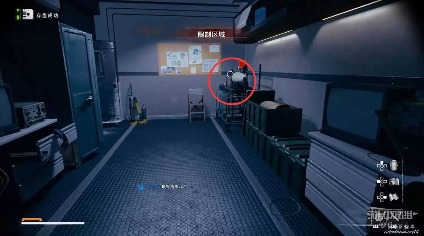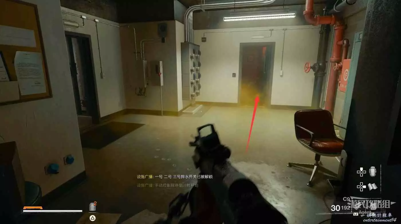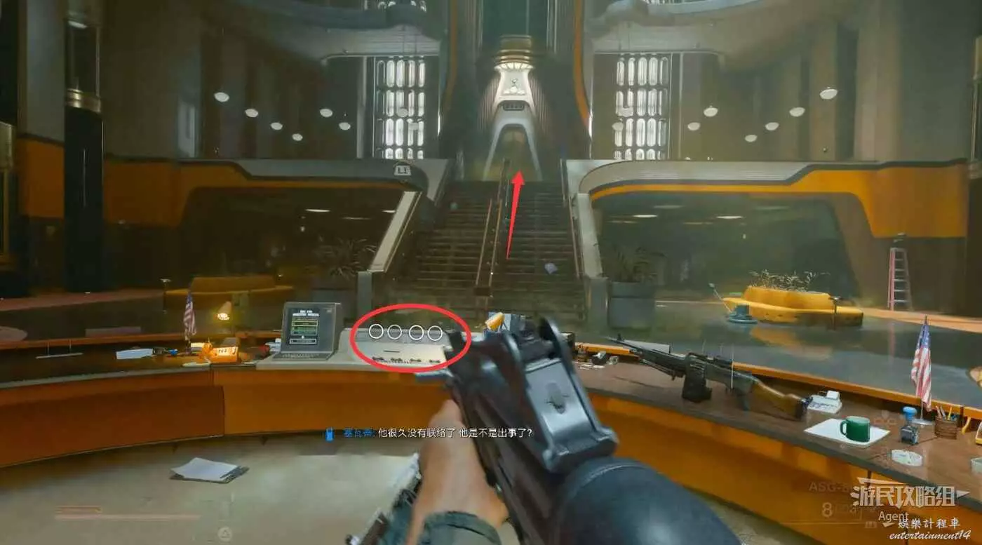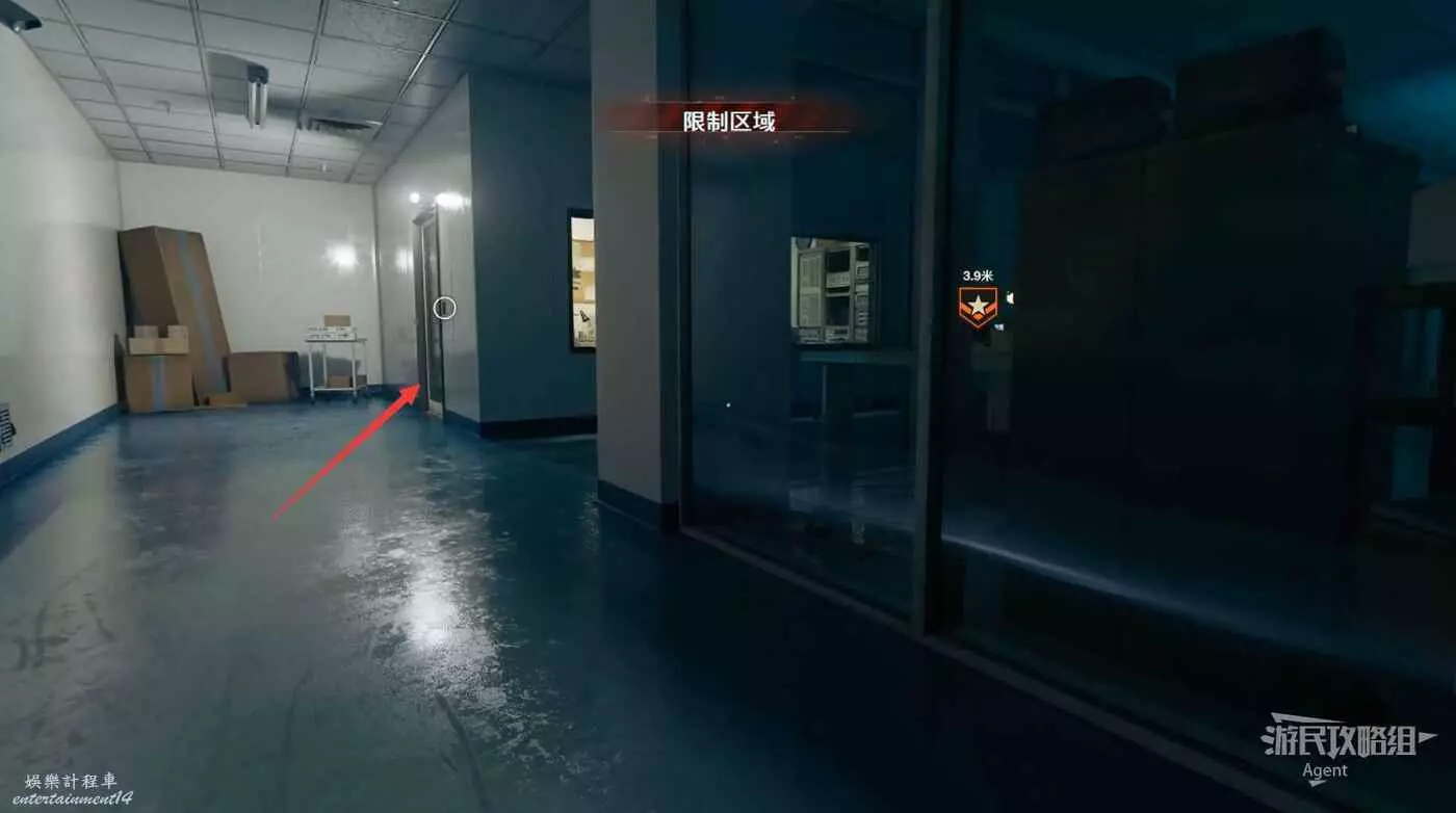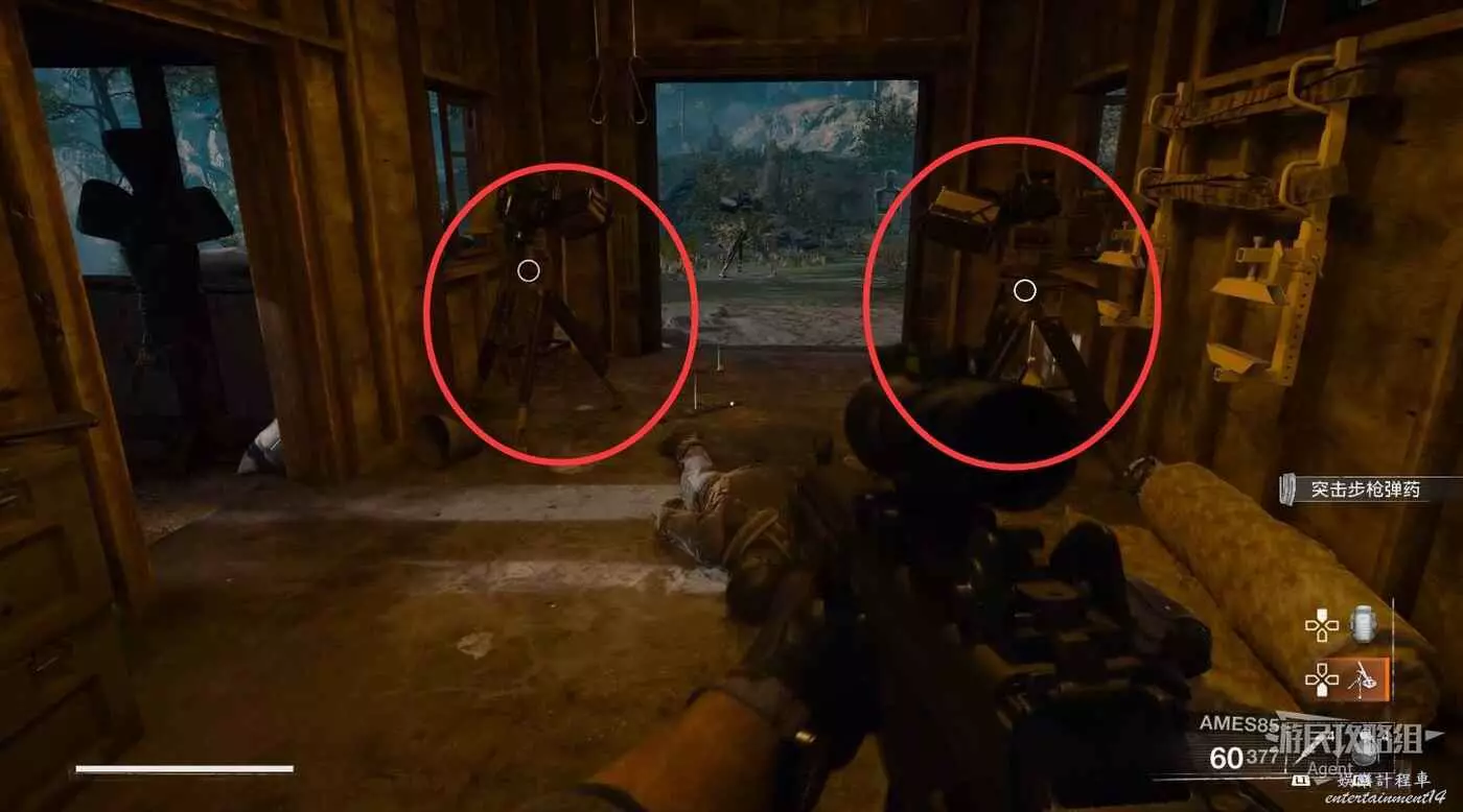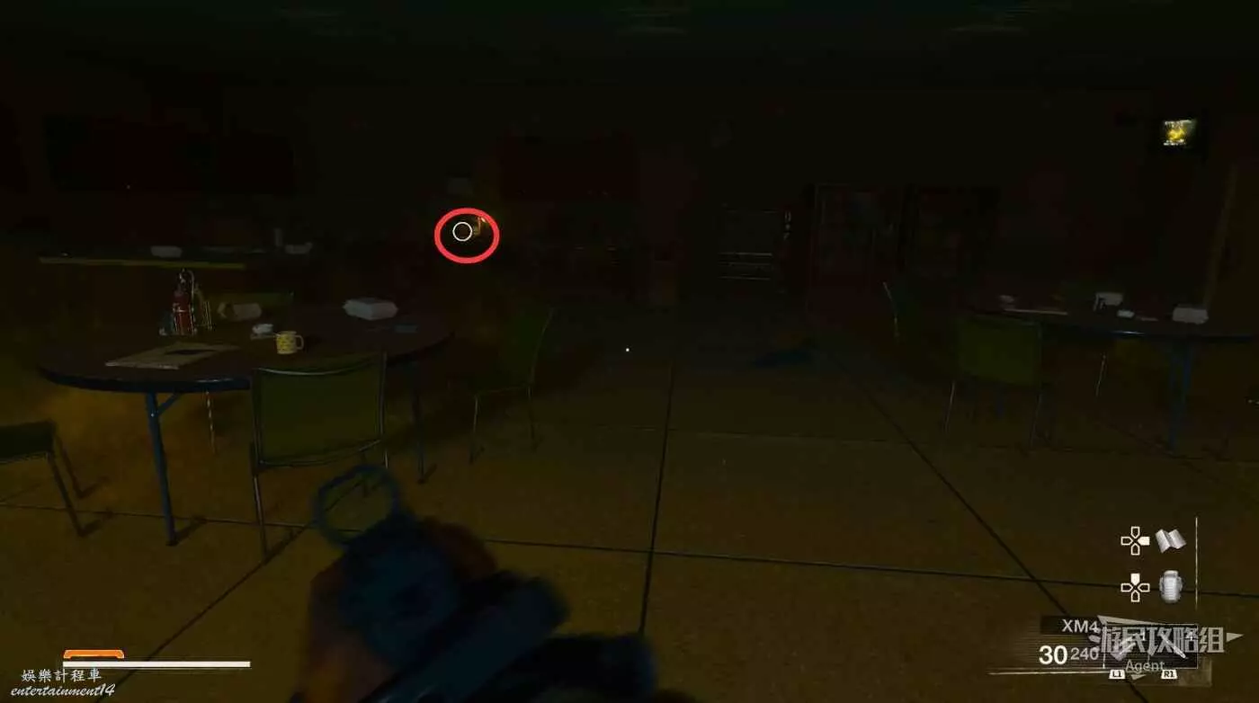 屋裡有很多敵人,躲到桌子底下,偷偷過去。如果中途被發現也不用慌,迅速沖過去炸掉配電器就行。