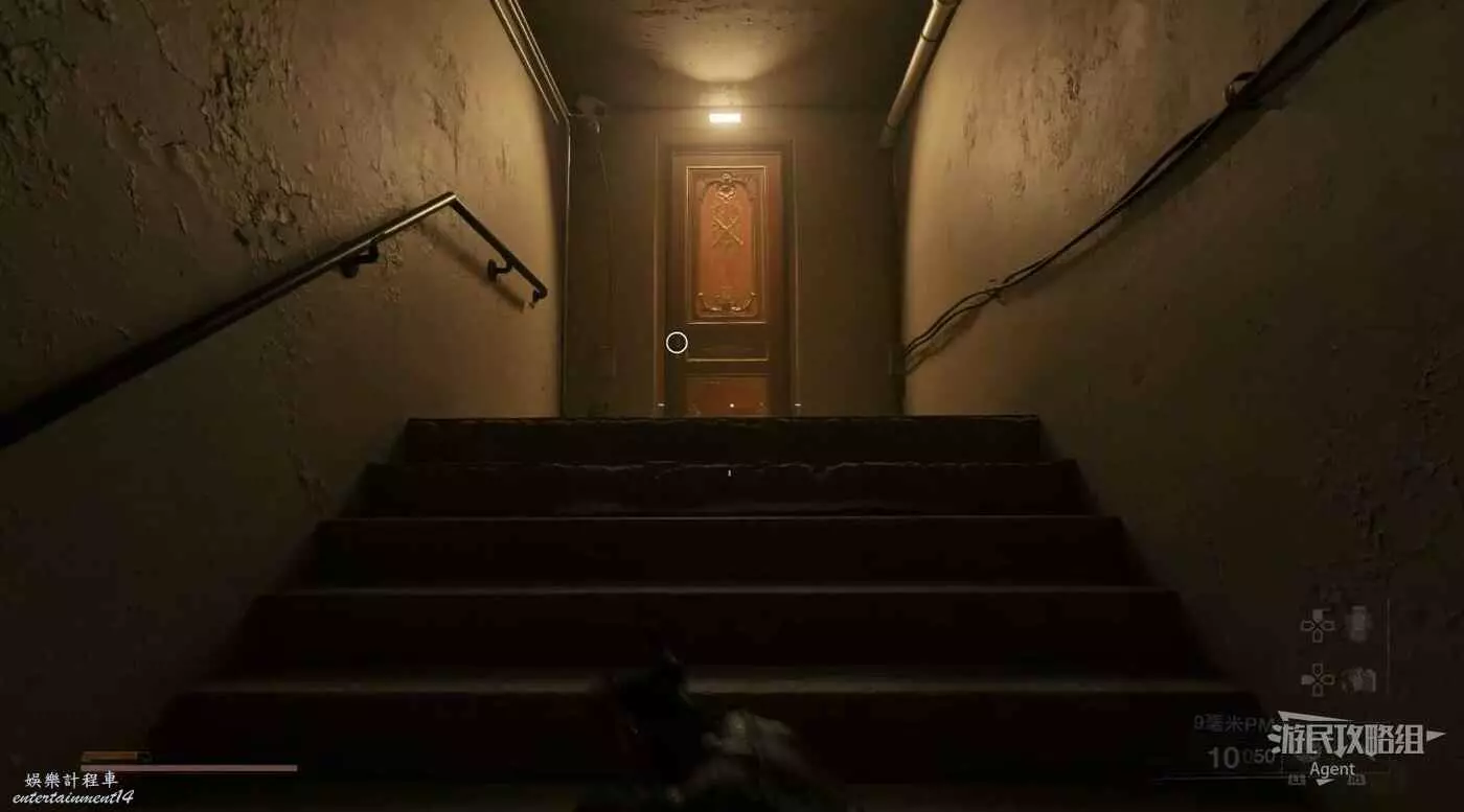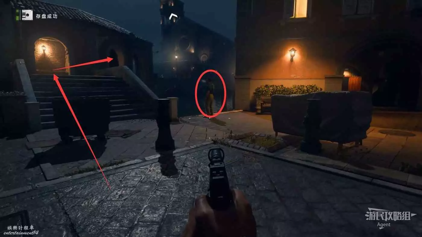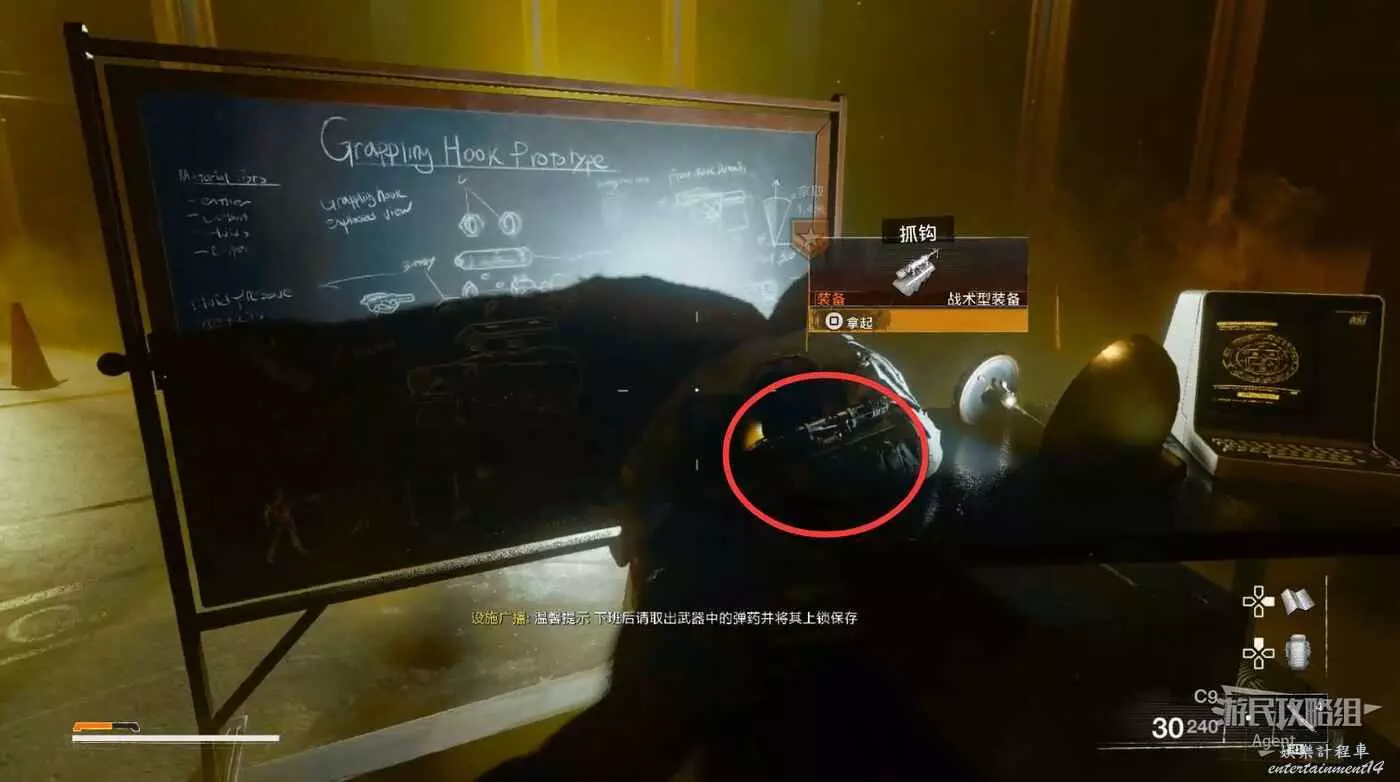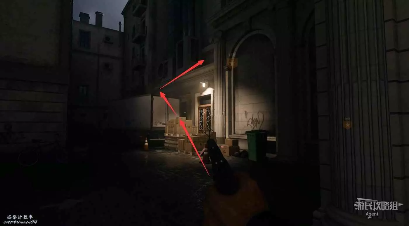 先拿上左邊的兩把槍,然後先不要去前面屍體處拿抓鉤,拿了抓鉤就會觸發戰鬥。