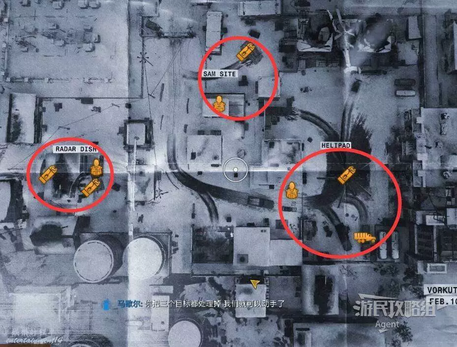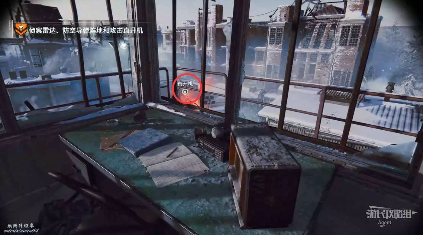 制服敵人換上偽裝,然後調查外面的三處地點:直升機、防空導彈基地、雷達。