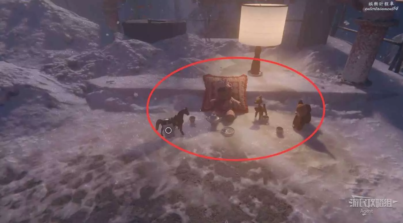 先是尋寶謎題,密碼箱的密碼分散在桌子、童子軍、茶派對三處,在附近找可以進的門,就可以找到這三處地方。