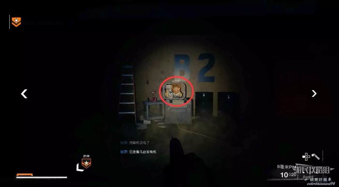 找第二塊玻璃碎片時落下來,按紅色按鈕發現升降機沒電,需要去找到並啟動四台發電機。