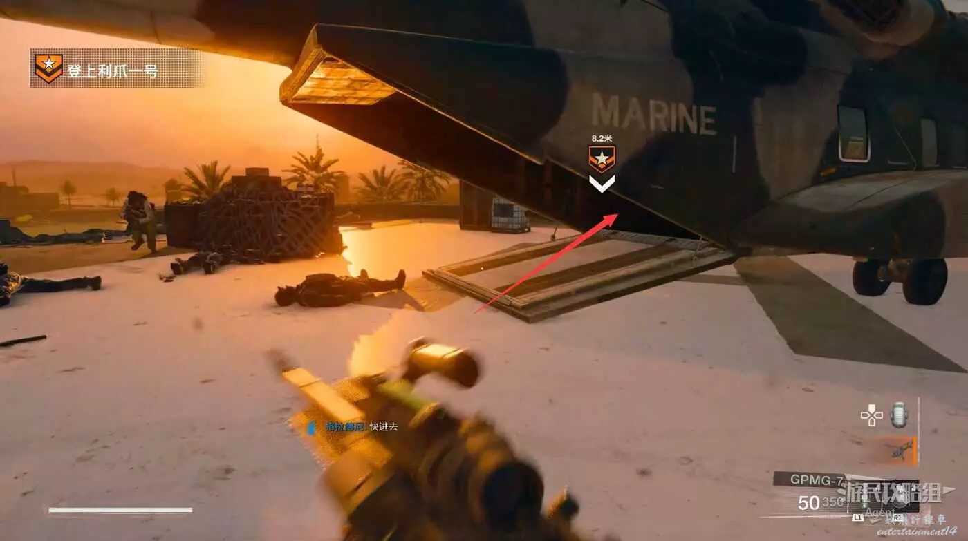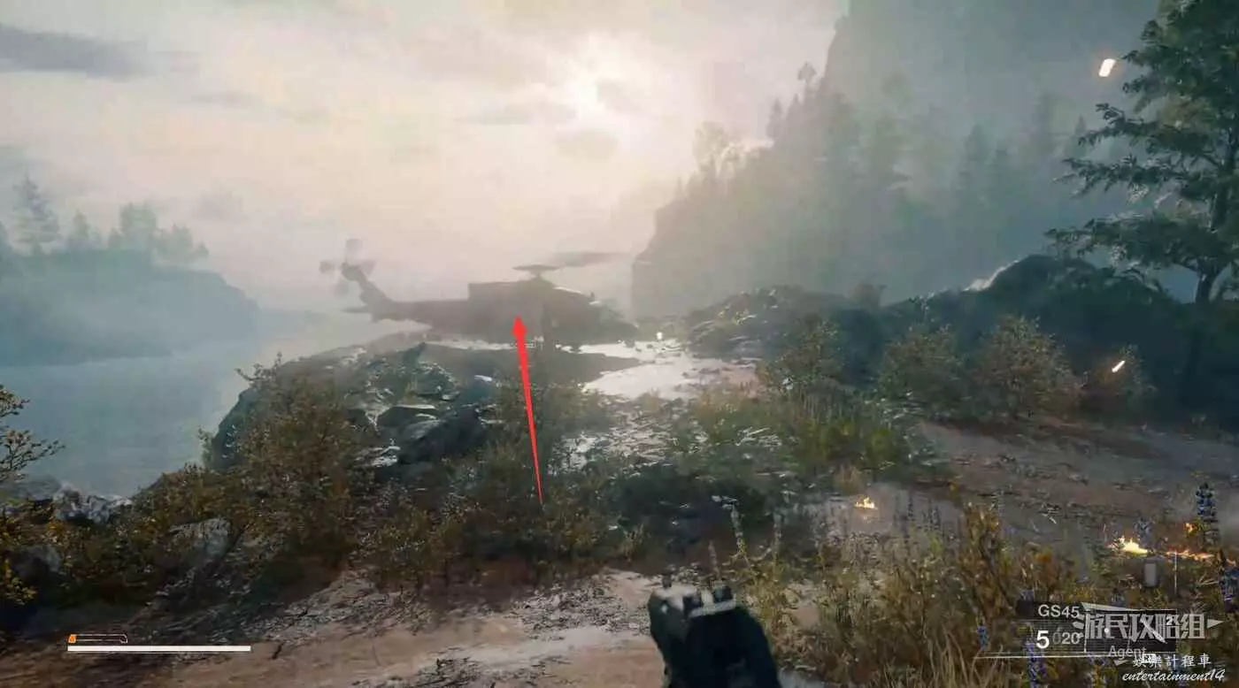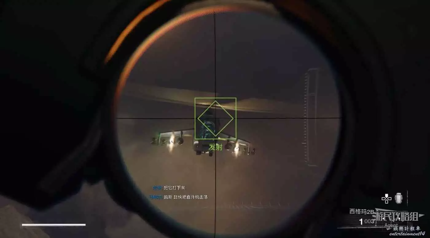 用火箭發射器打飛機,待瞄準框變成綠色時射擊。前幾下可能會被直升機釋放的干擾彈干擾,多打幾下把直升機打下來。