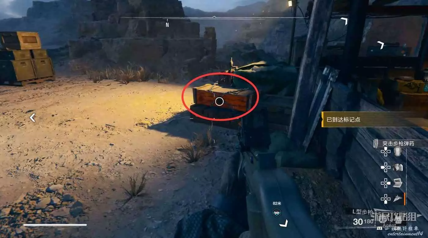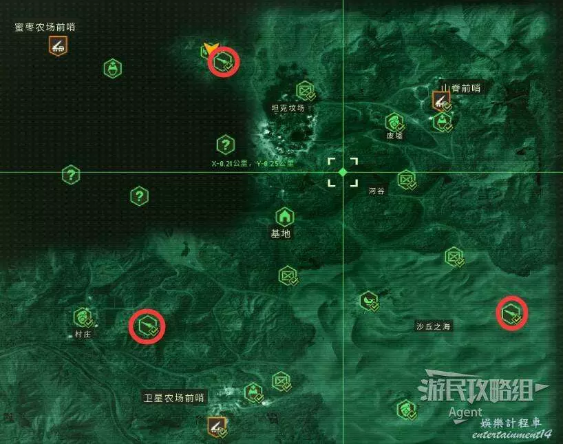 地圖上有四個敵軍營地,電臺和保險箱在村莊的敵軍營地裡。