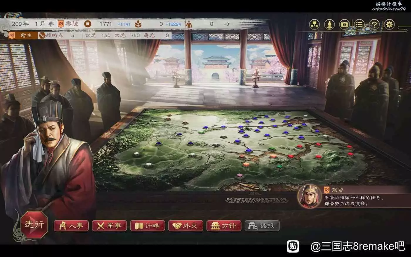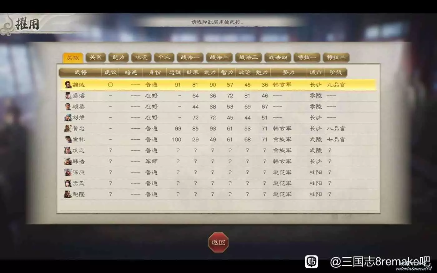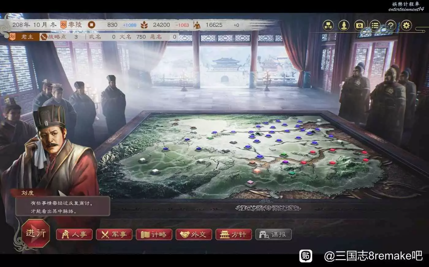 三國志 8 Remake 高級208劉度圖文戰報 25 10 月 2024-10-25 廣告 作者:哆啦AQ 來源:三國志8remake吧 三國志14玩過幾百小時,這次試試重製版8,以前沒玩過8,但是玩過13。 比三國志14的劉度好多了,刷開局可以刷到魏延,開局徵兵下就可以過了 第一回合評定結束後找黃忠韓浩,刷刷關係,沒錢就金庫裡面取,送禮對話單挑 第二回合評定直接打長沙,招黃忠韓浩,打了半天隻剩韓玄和魏延了 第三次評定,招兵,評定後去找飯手下挖人 第四回評定,拿下貴陽,除了找飯都招了