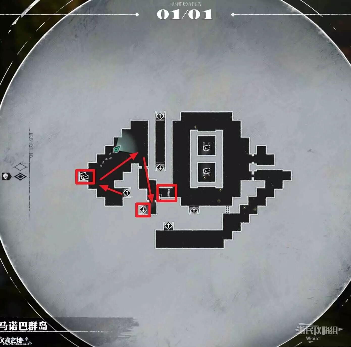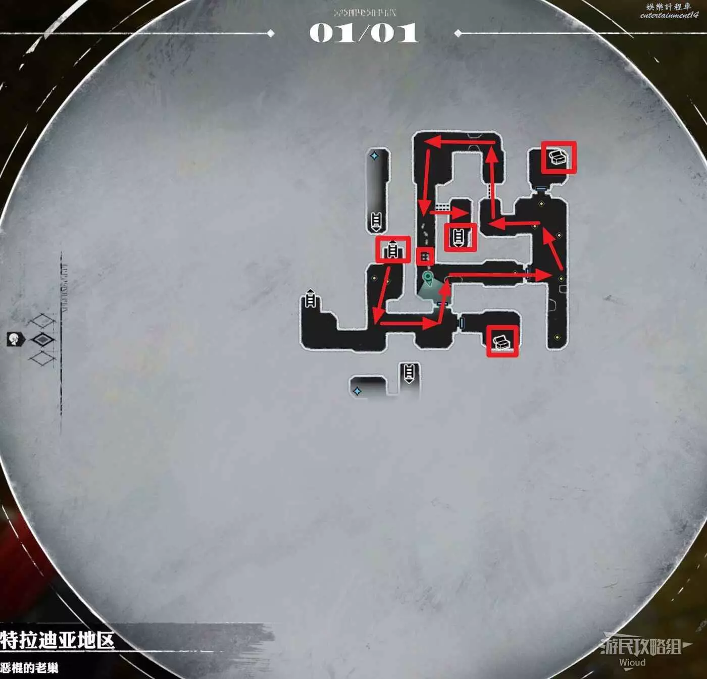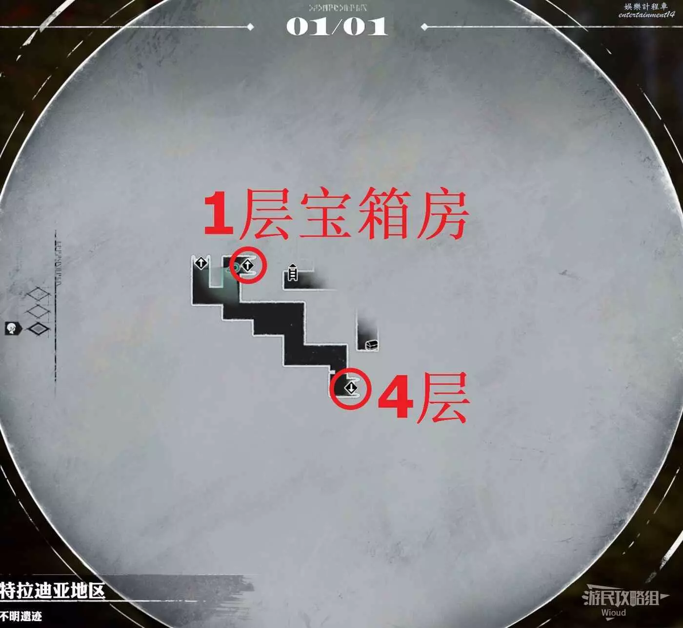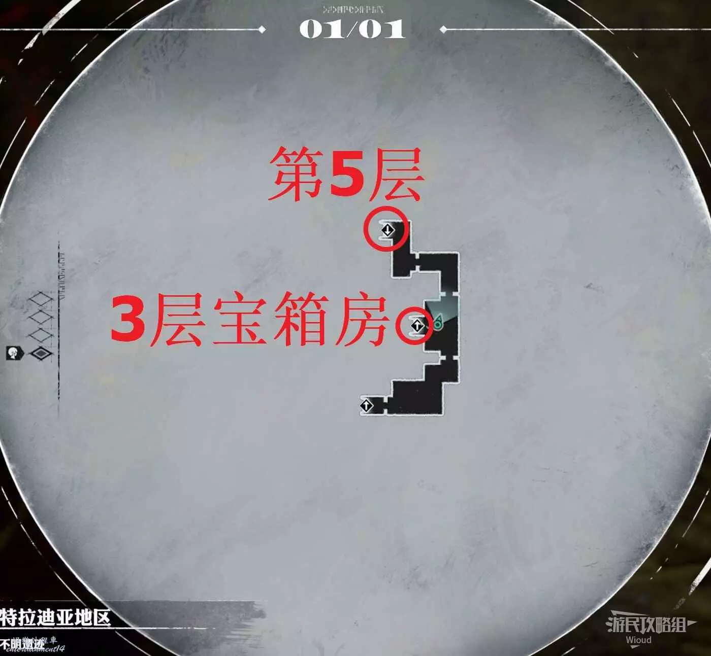 地圖左下角與右上角的寶箱都可以直接拿,右下角需要通過一個沒有指引的樓梯走過去,路線也在下圖展示出來了;