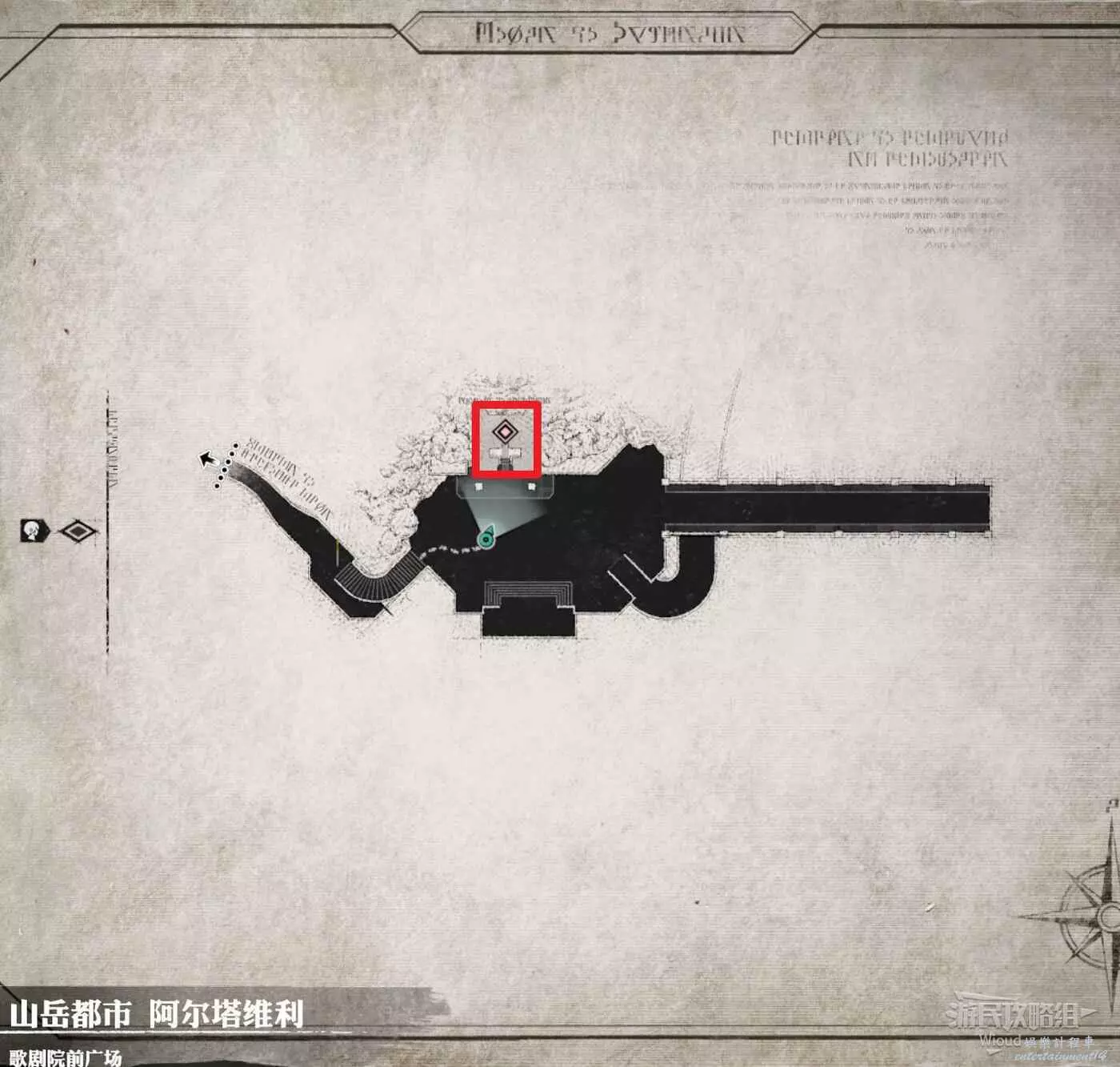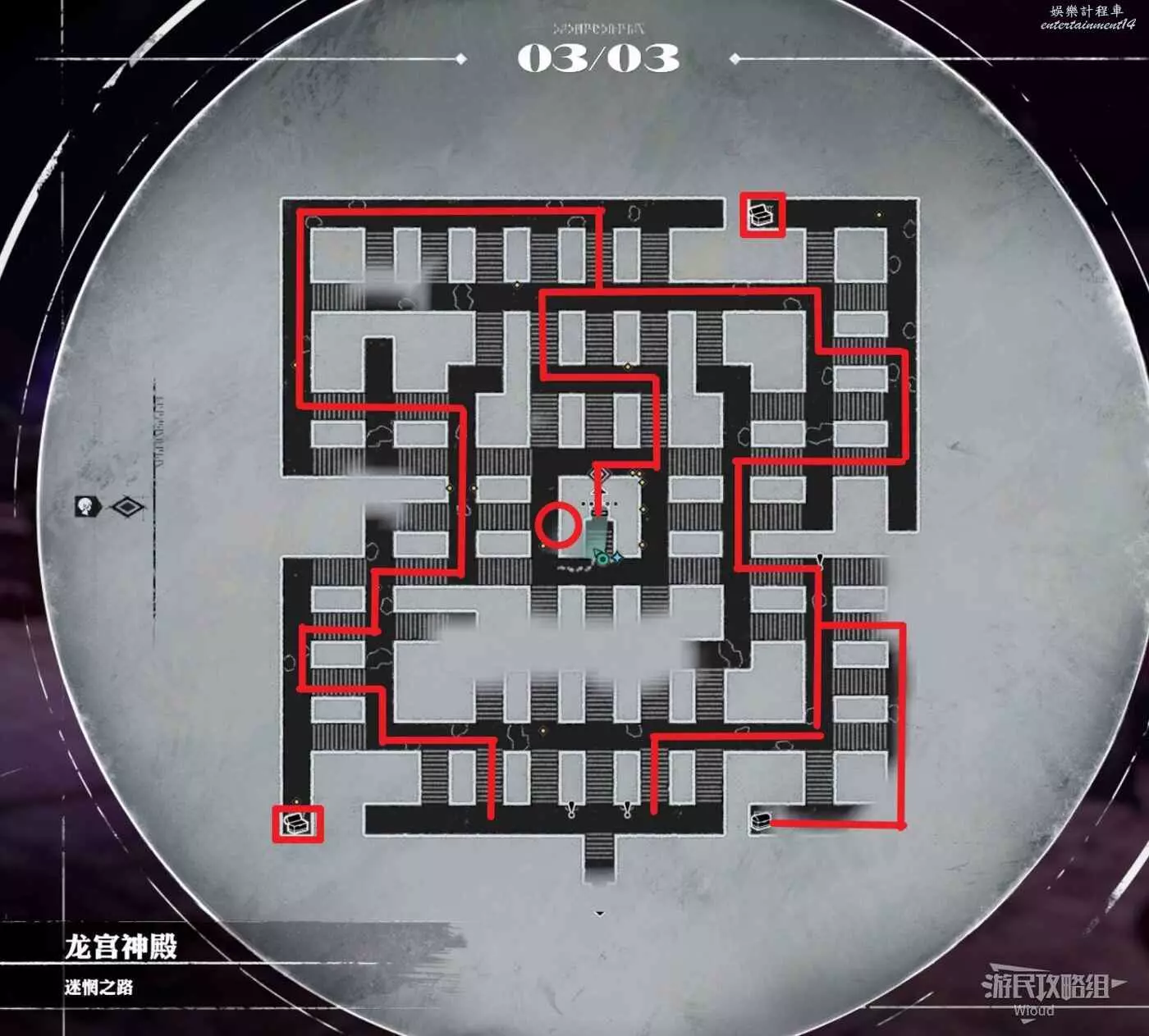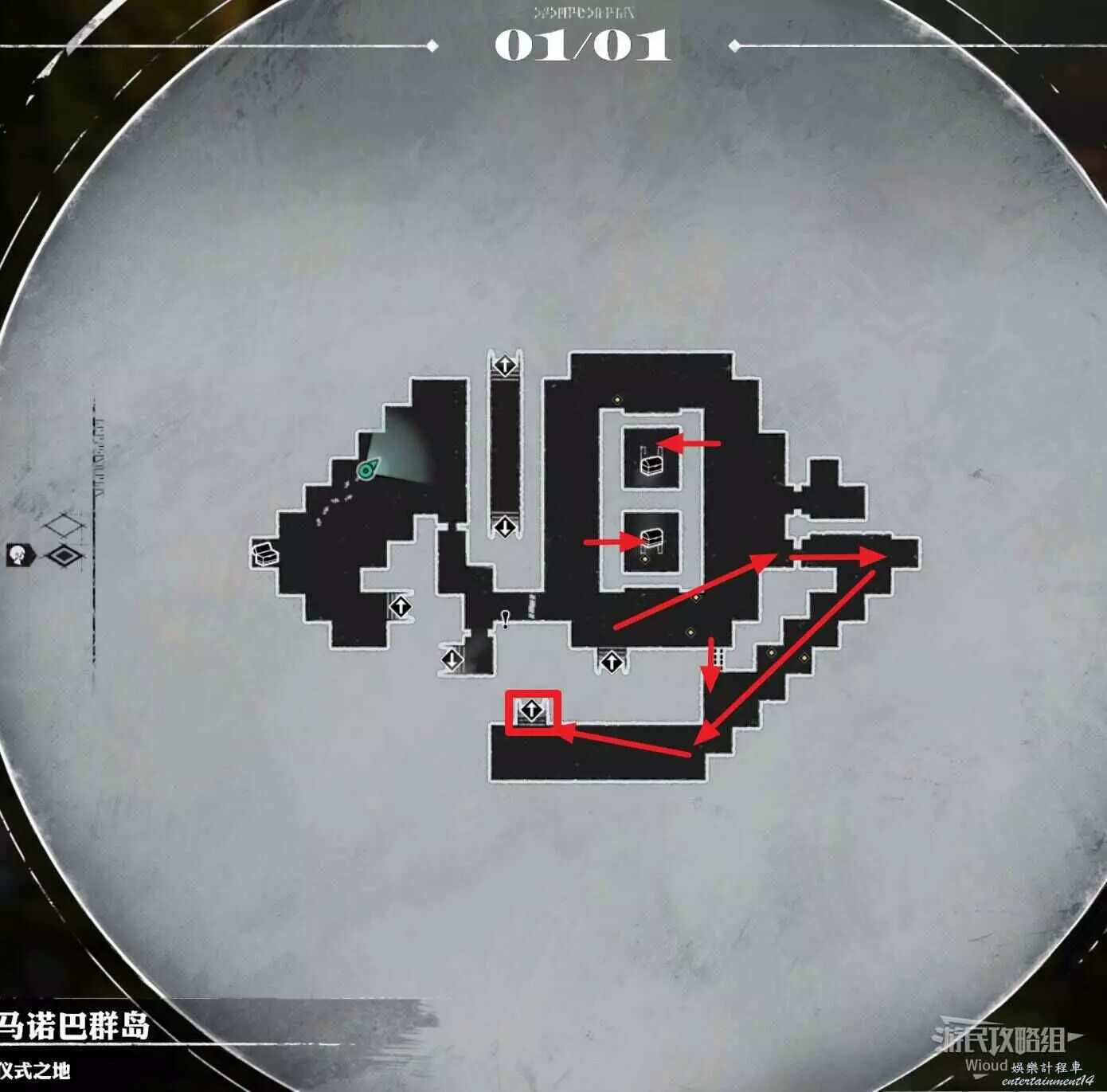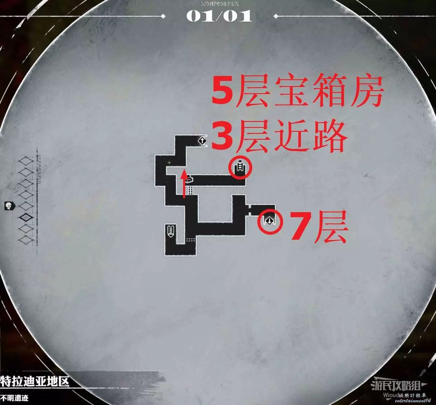 地圖左下角與右上角的寶箱都可以直接拿,右下角需要通過一個沒有指引的樓梯走過去,路線也在下圖展示出來了;