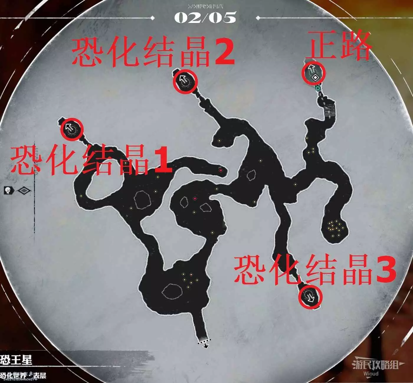 繼續走到深層,這裡與表層相同有三個恐化結晶,正路在地圖的右上角。