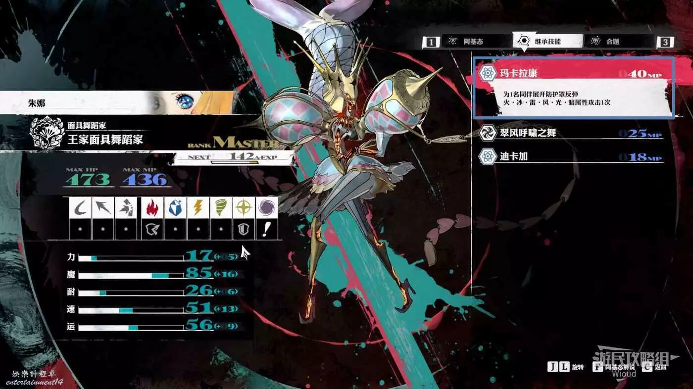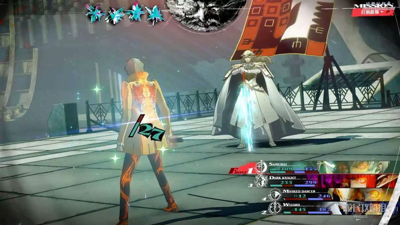 第二個角色選擇朱娜,使用【王家面具舞蹈家】,繼承技能【翠風呼嘯之舞】,每回合都給敵人上【風】屬性弱點,然後攜帶【救世主】面具隨時支援隊友血量。