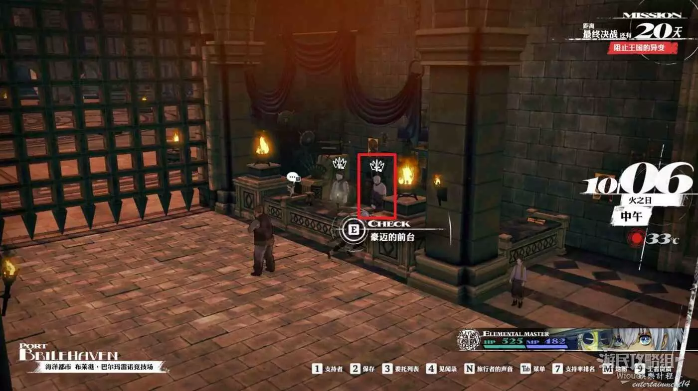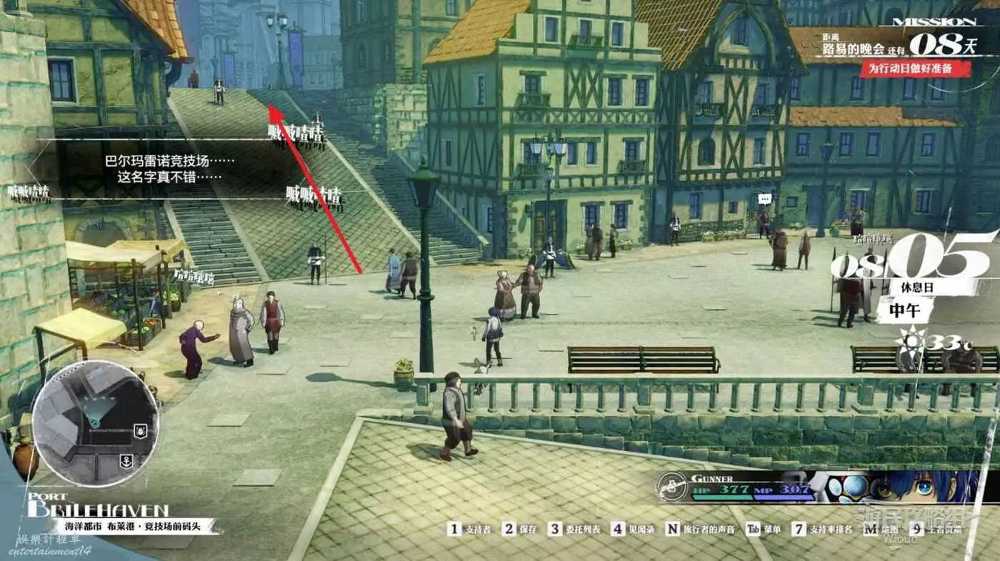 傳送到【競技場前碼頭】往左上角的競技場入口走,與【豪邁的前臺】對話選擇【參加】資格戰,接取任務【打倒競技場的怪物】,在正式挑戰之前存個檔,如果挑戰失敗也會流逝半天。