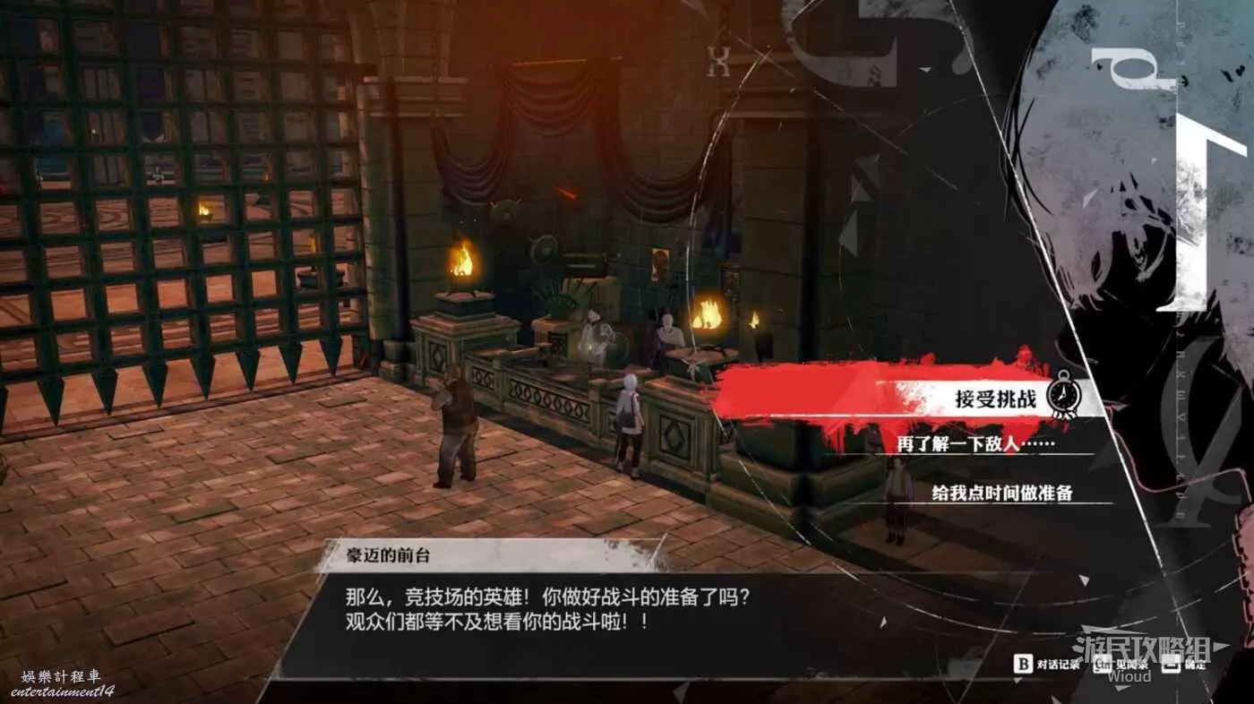 【競技場前碼頭】往左上角的樓梯走,進入競技場門口與穿著紫色衣服的【趾高氣昂的貴族】對話。