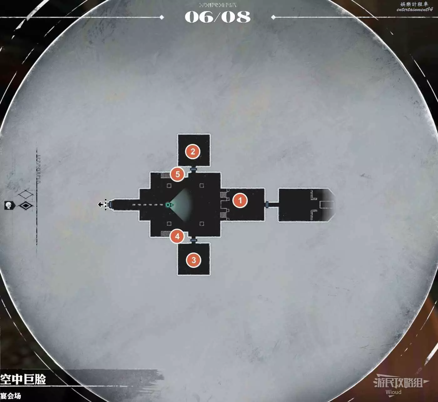 隨後從黃色編號3的位置出來,打開地圖下方黃框所示的門從左側綠色箭頭區域出現,繼續沿著路線走,從地圖左邊出現後直接進入BOSS房戰鬥。