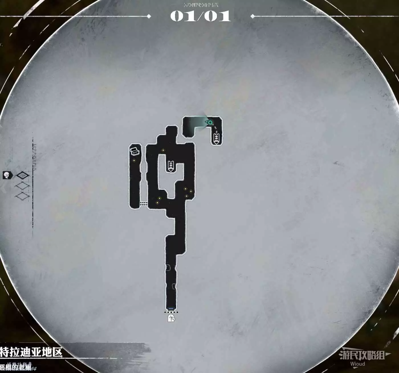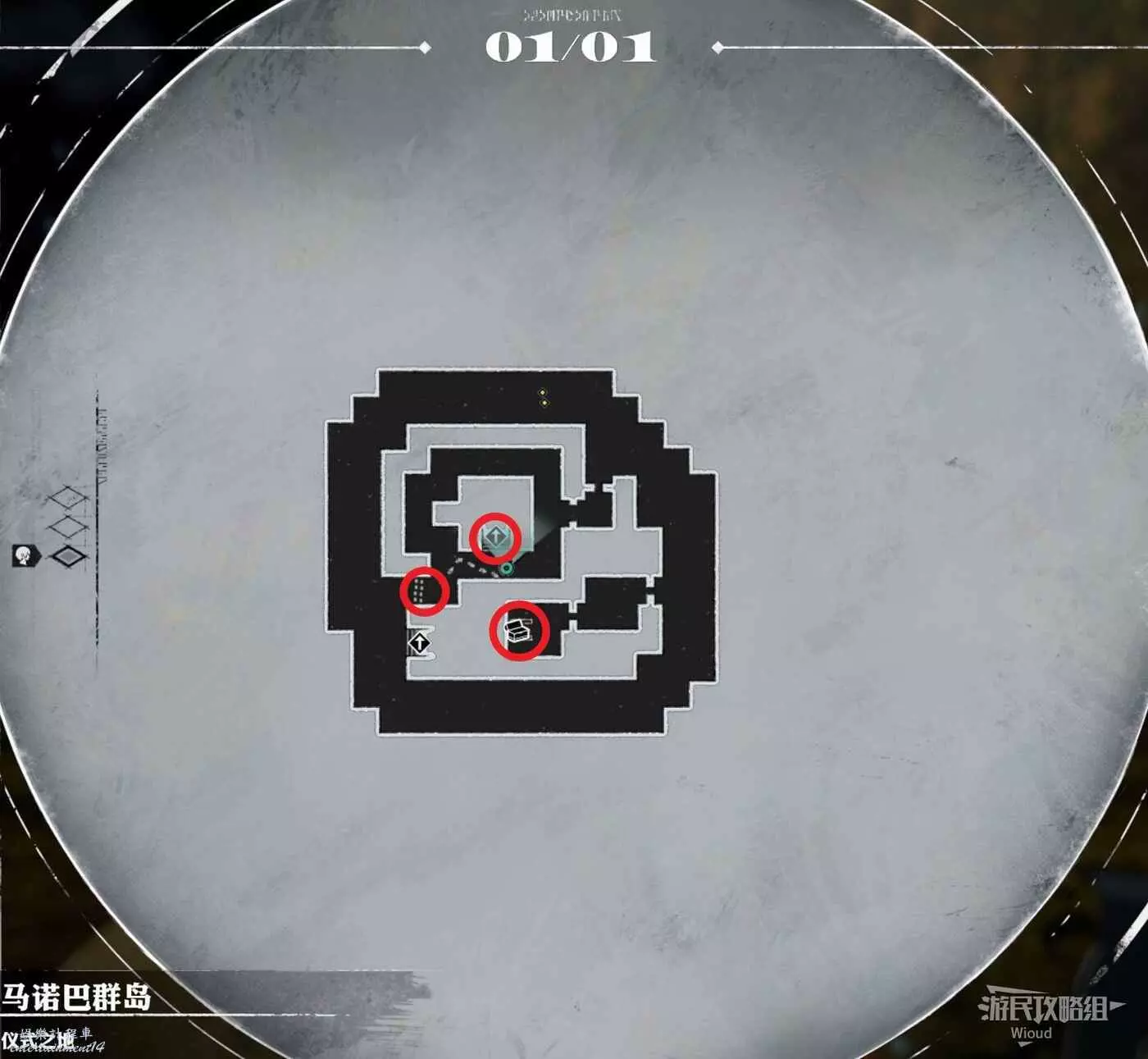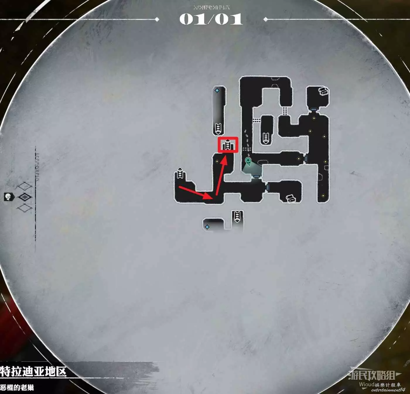 將入口右邊可以直接探索的區域走一遍,拿完所有藍點道具;與地圖中間黑色“!”處的機關互動,開啟機關右側與地圖下方的大門。
