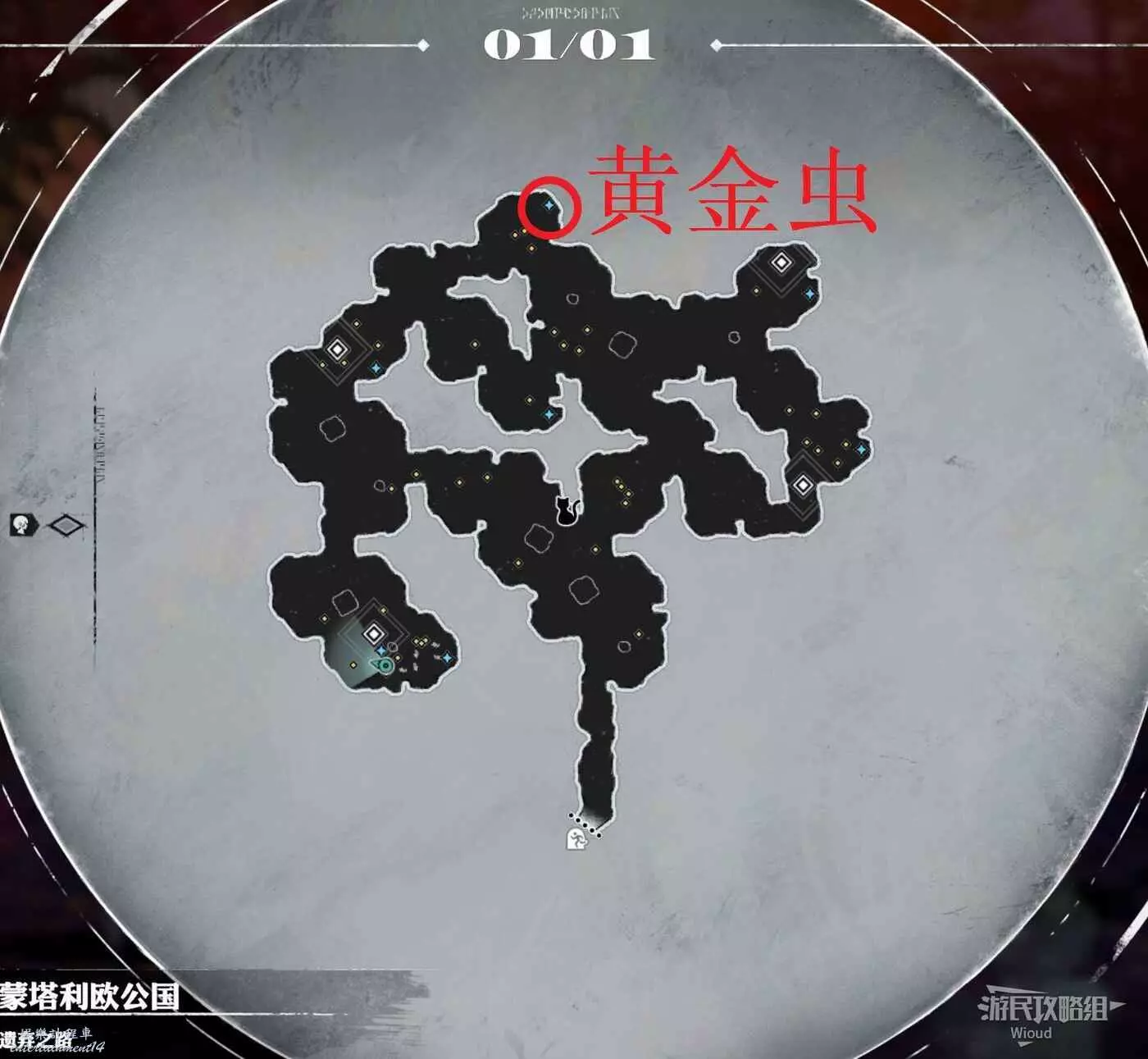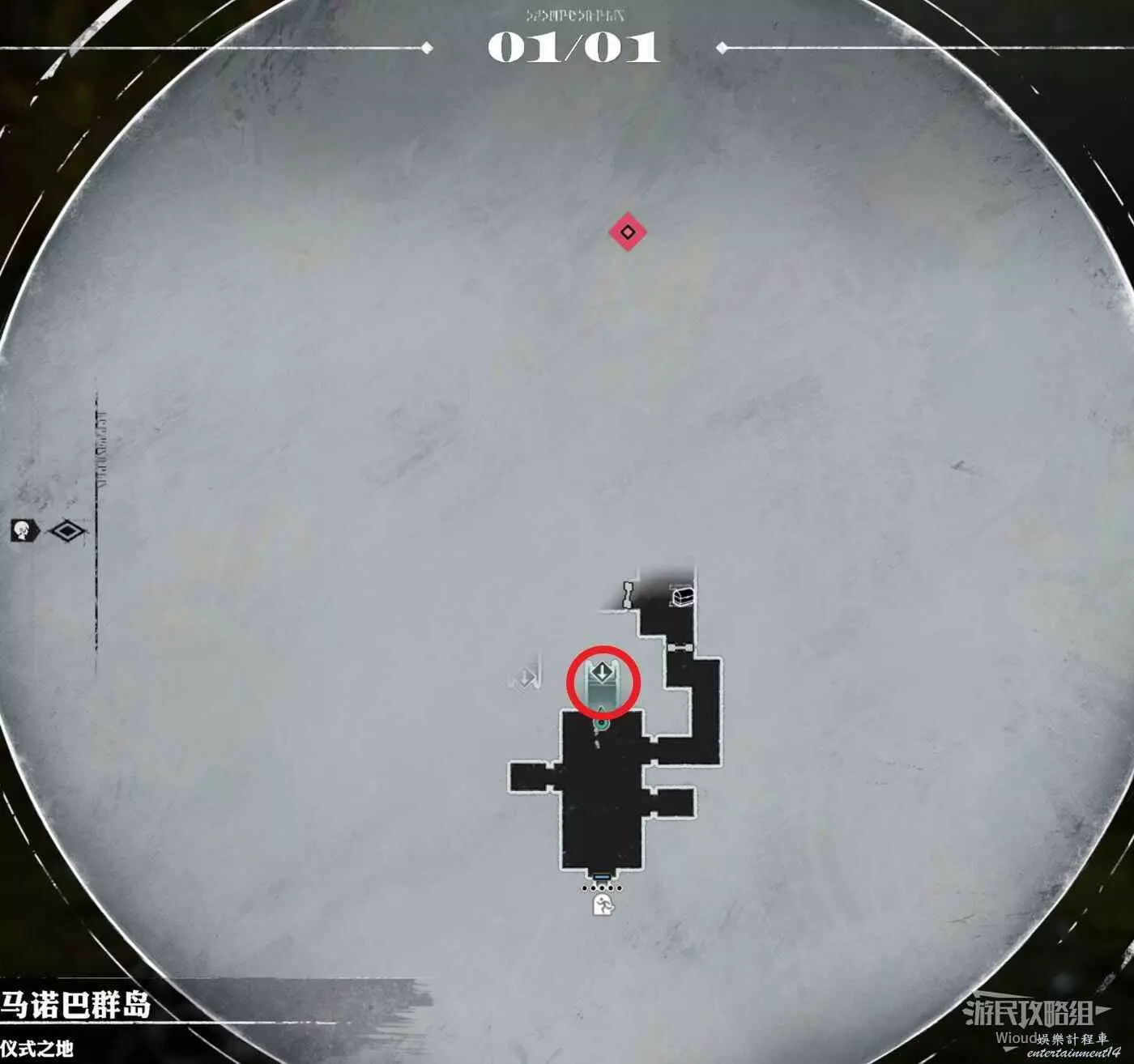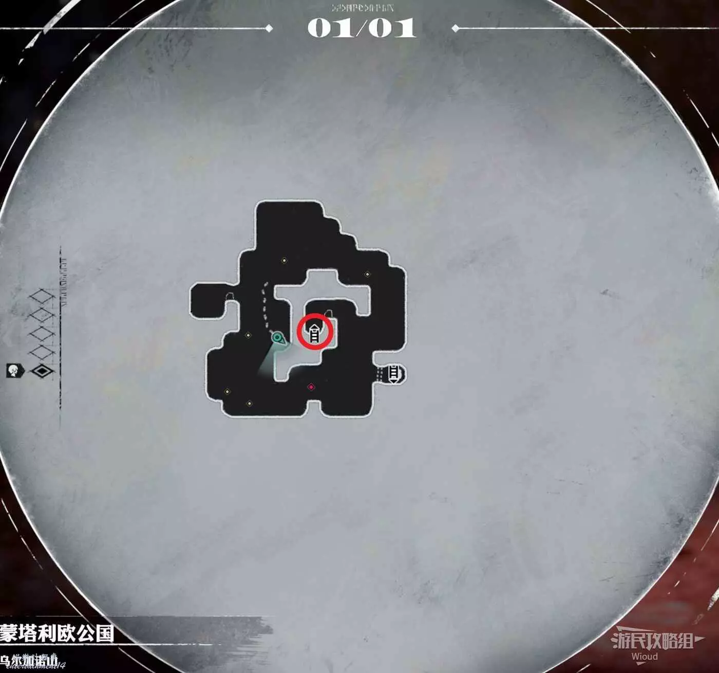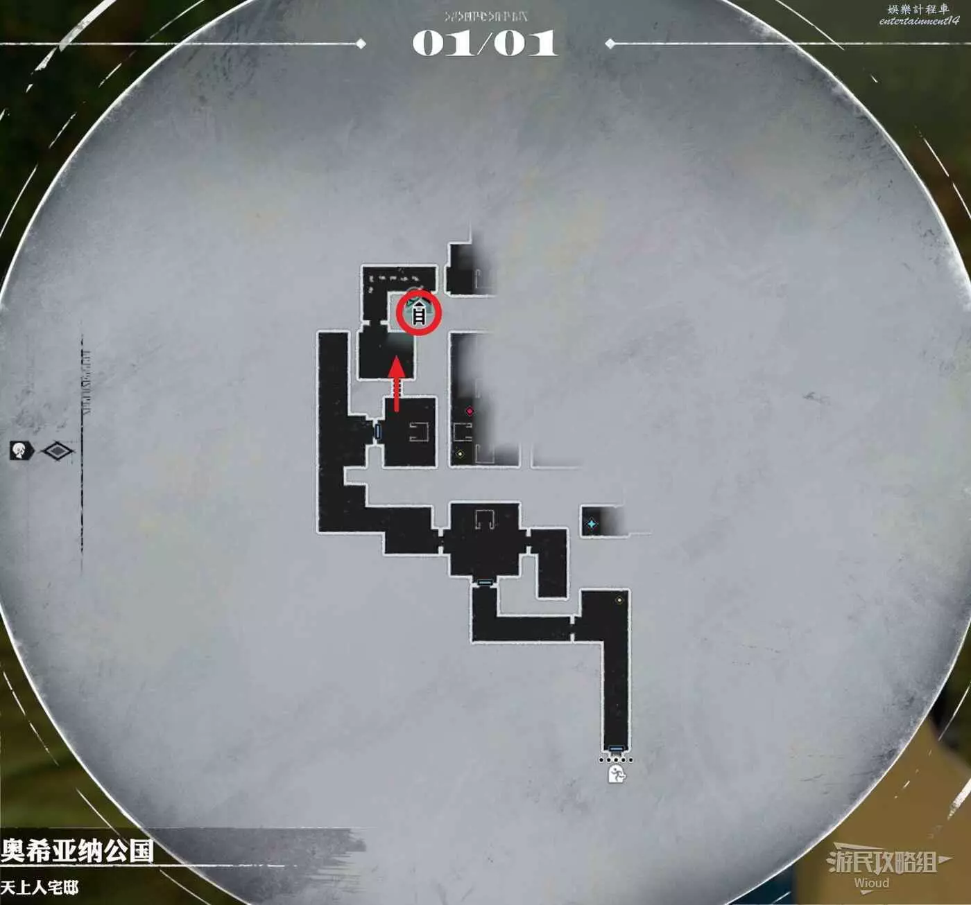 將入口右邊可以直接探索的區域走一遍,拿完所有藍點道具;與地圖中間黑色“!”處的機關互動,開啟機關右側與地圖下方的大門。