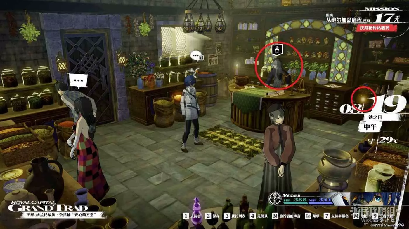 傳送到酒館【蜜蜂耳語亭】在順風耳處購買關於枯萎藥的情報,然後傳送到王都的雜貨鋪【安心藥方堂】。