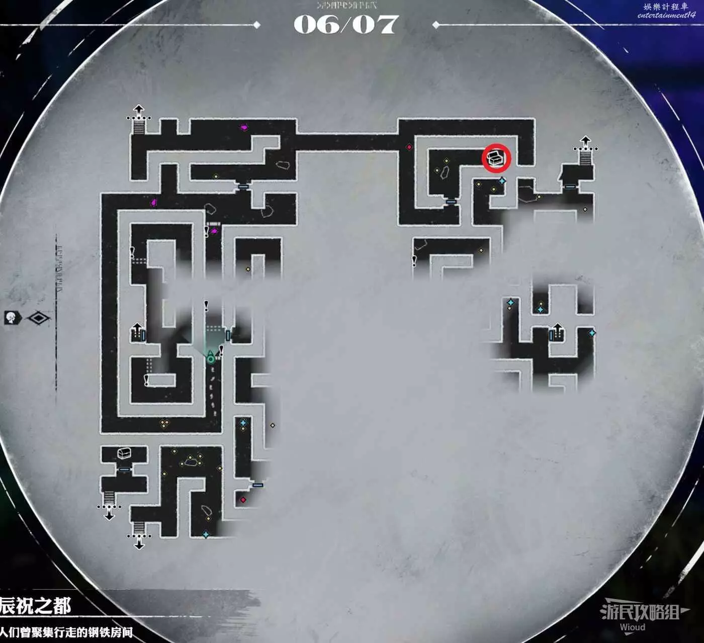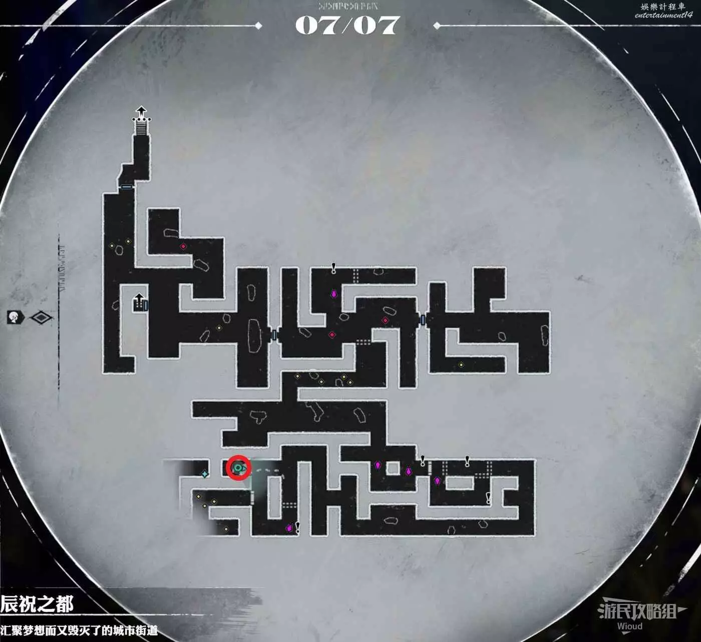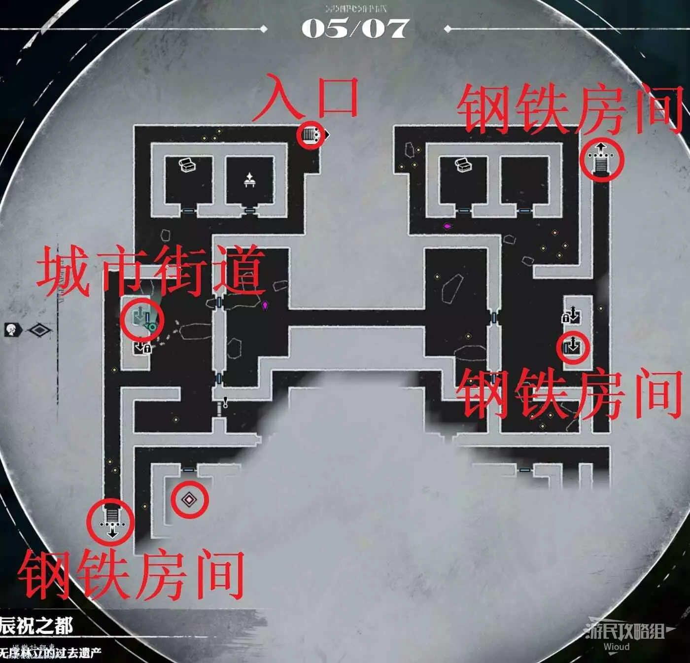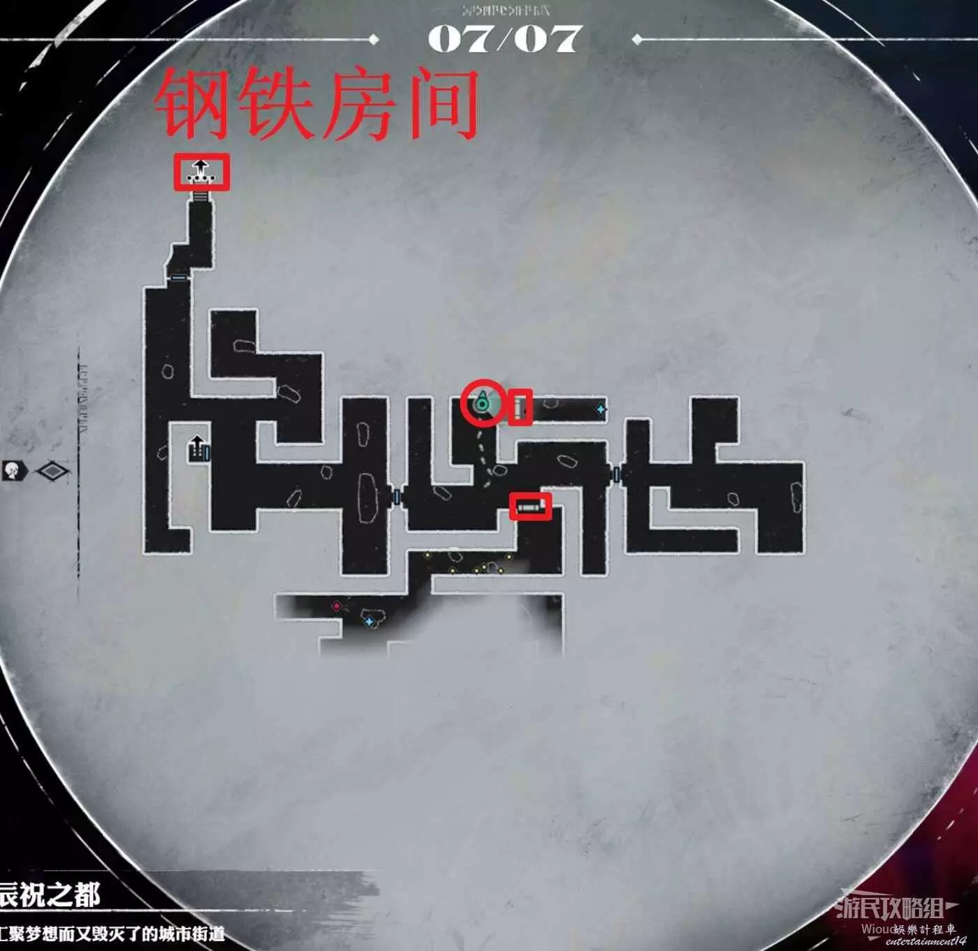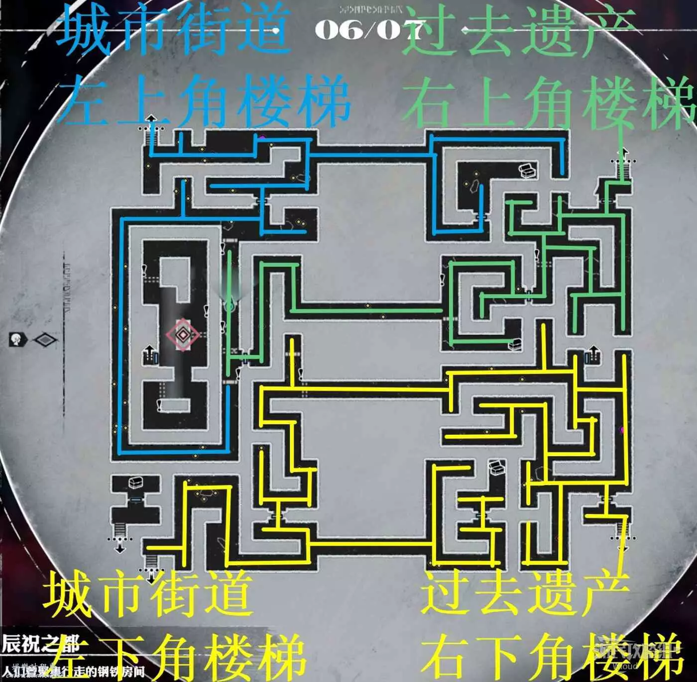 可以將【彙聚夢想而又毀滅了的城市街道】看作一個中間層,通過【城市街道】的兩個樓梯口可以探索【鋼鐵房間】兩塊地方。