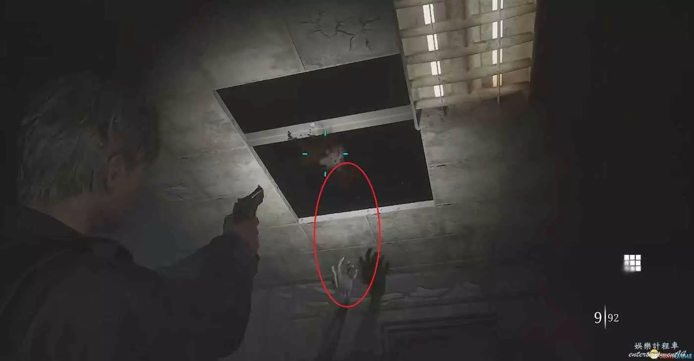 先用手槍攻擊怪物抓住橫樑的手將他打下(不好打手就多開幾槍打身上)。