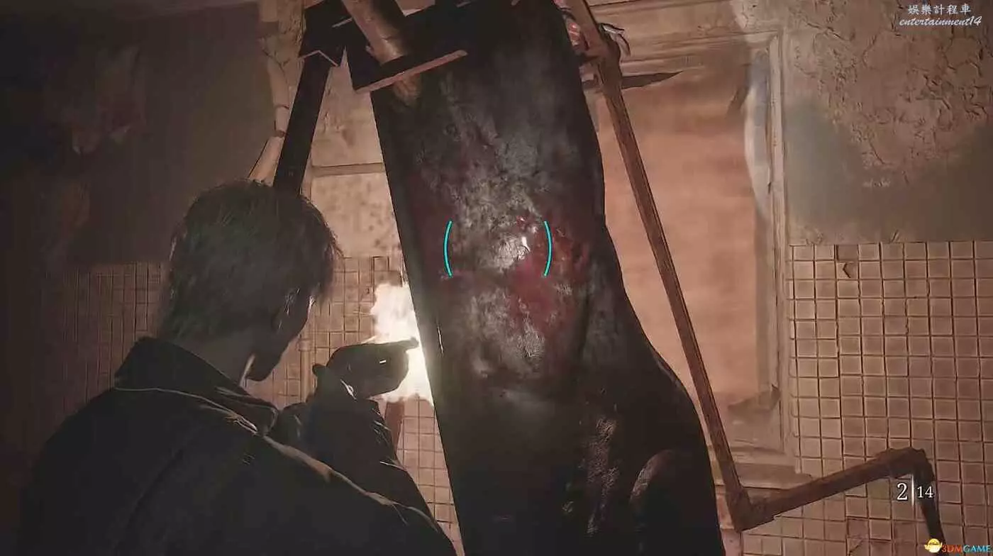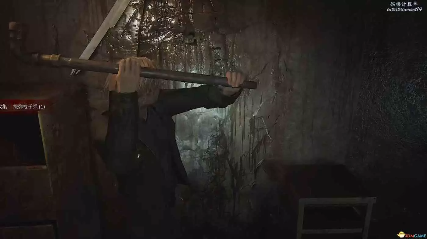 然後上去用鋼管猛砸,等怪物再次躍起抓住橫樑,由用手槍打下,繼續砸。