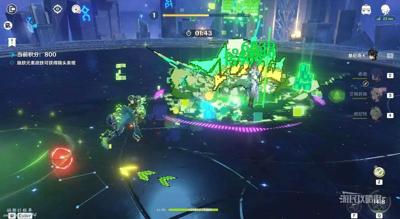 積分倍率選擇10,根據增益效果建議儘量組成能觸發燃燒和烈綻放反應的陣容,尤其是試用角色基尼奇和艾梅莉埃,可以組合使用,搭配兩位元火元素輔助或增傷即可。