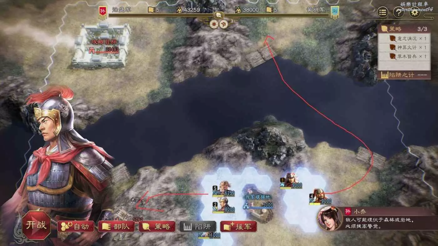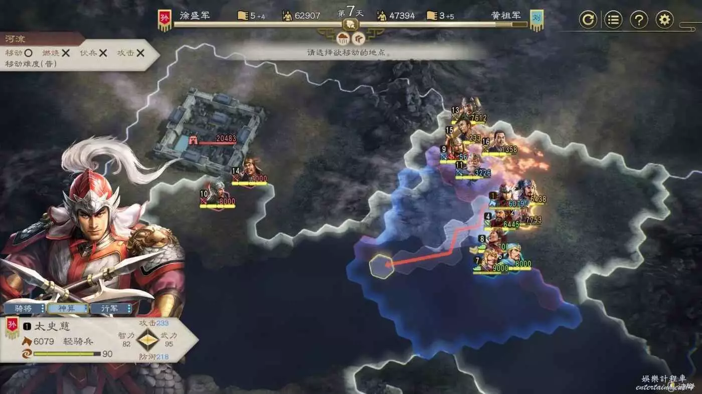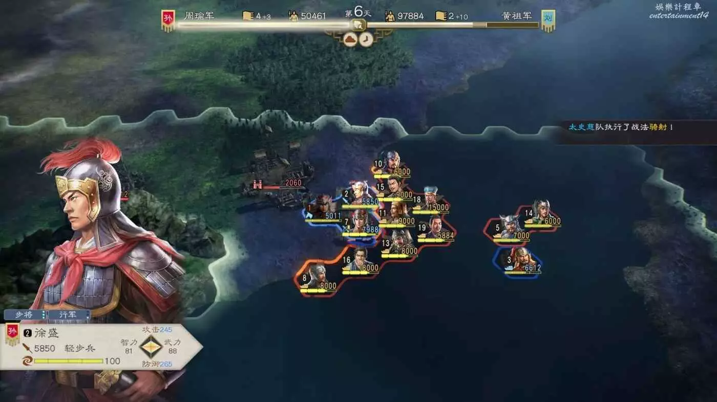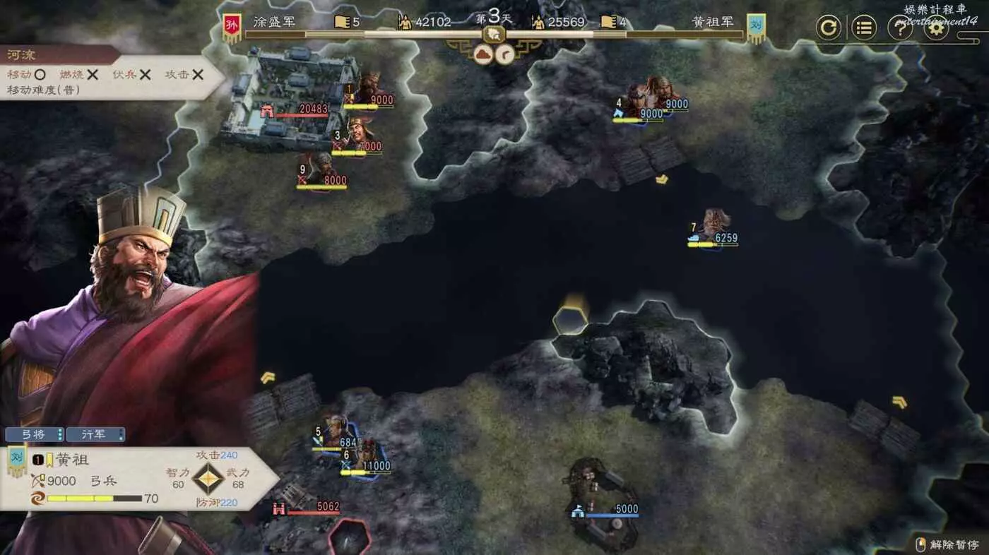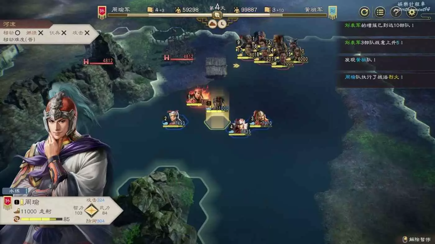 開戰後第3天,太史慈跟程普、黃蓋先過河到前線,我們和周瑜速通左下角兩隊人馬然後拆了烽火台