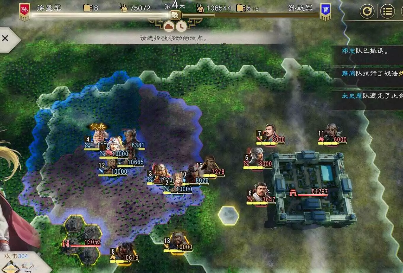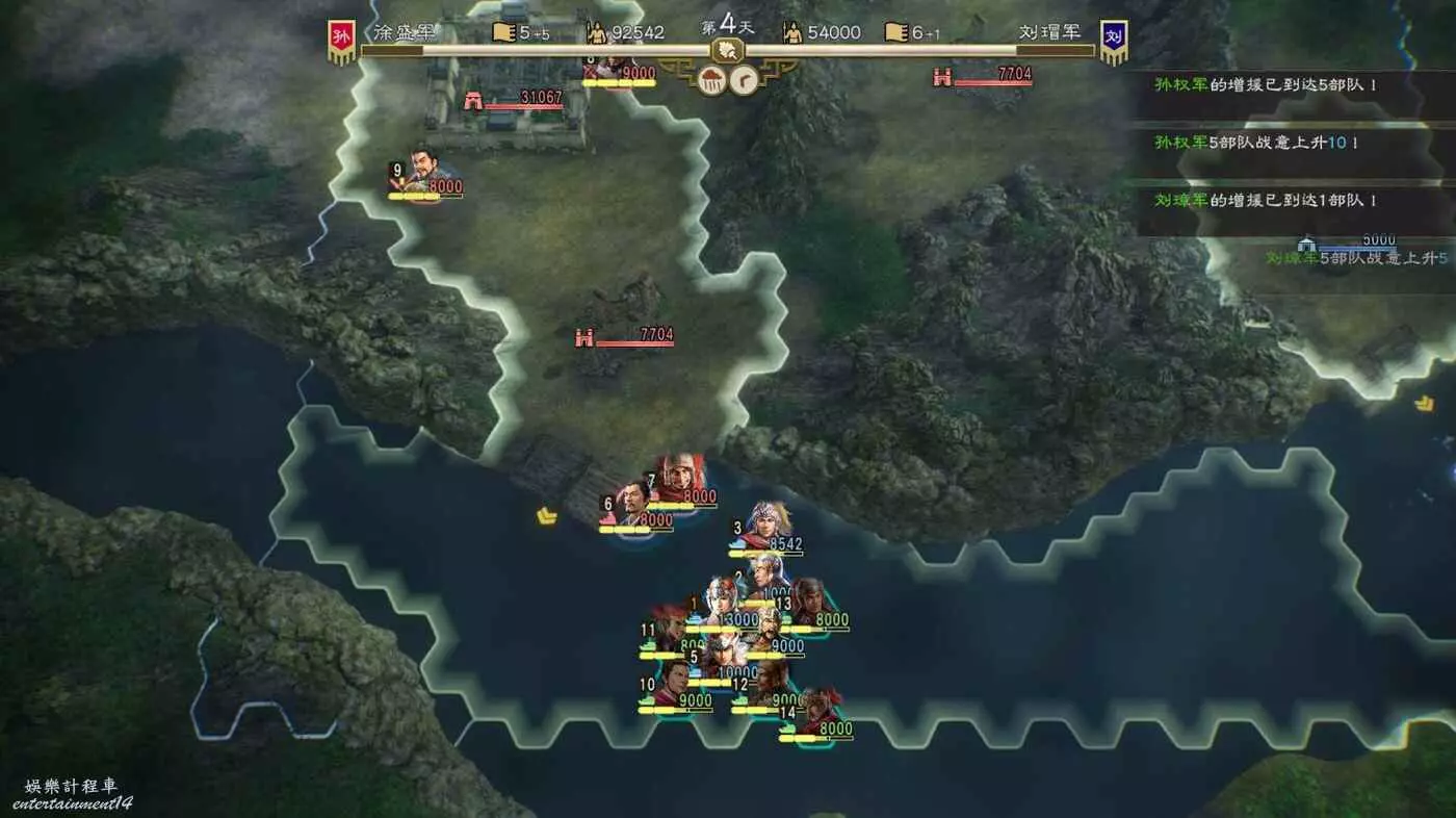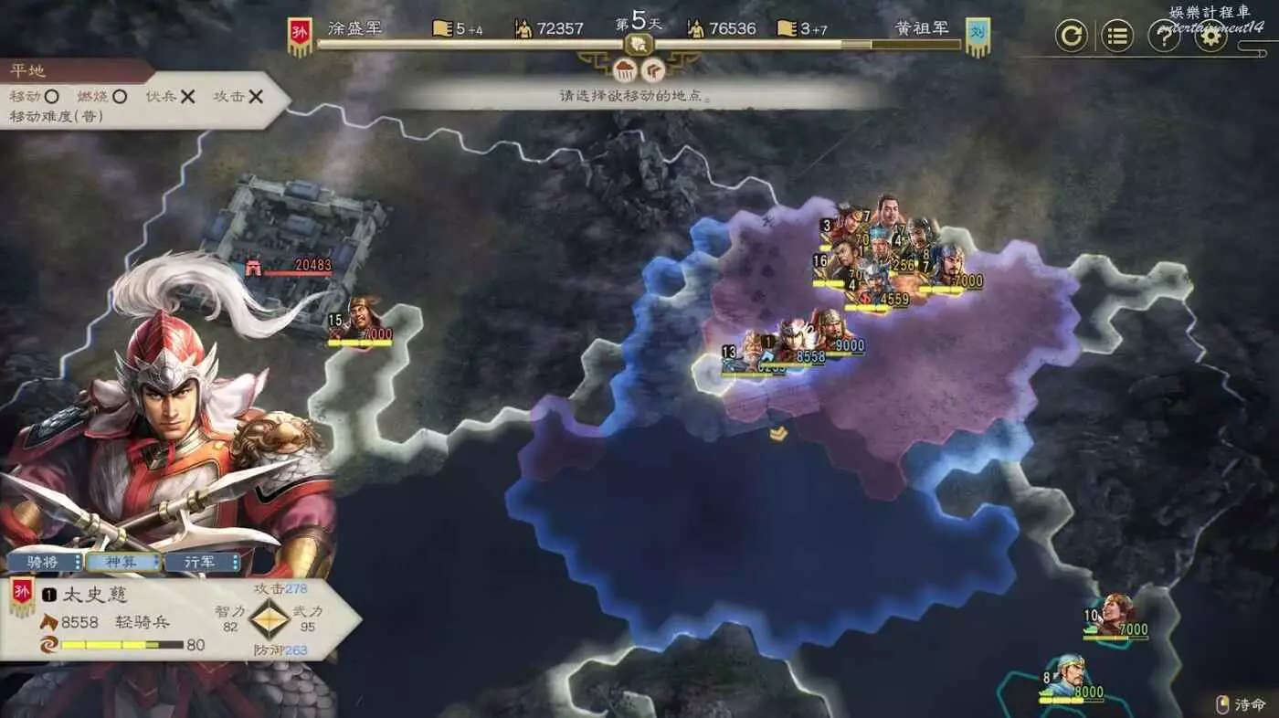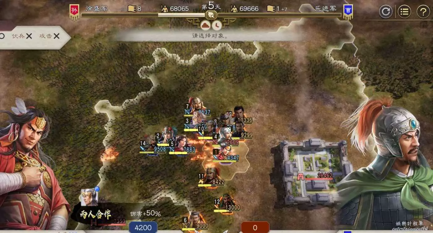 第四天搶下一輪援軍剛到無法攻擊的間隙全力輸出一波,同時要記得不要吸引到左邊城池附近的敵軍,避免腹背受敵(圖中為第5天是因為剛操作完。)