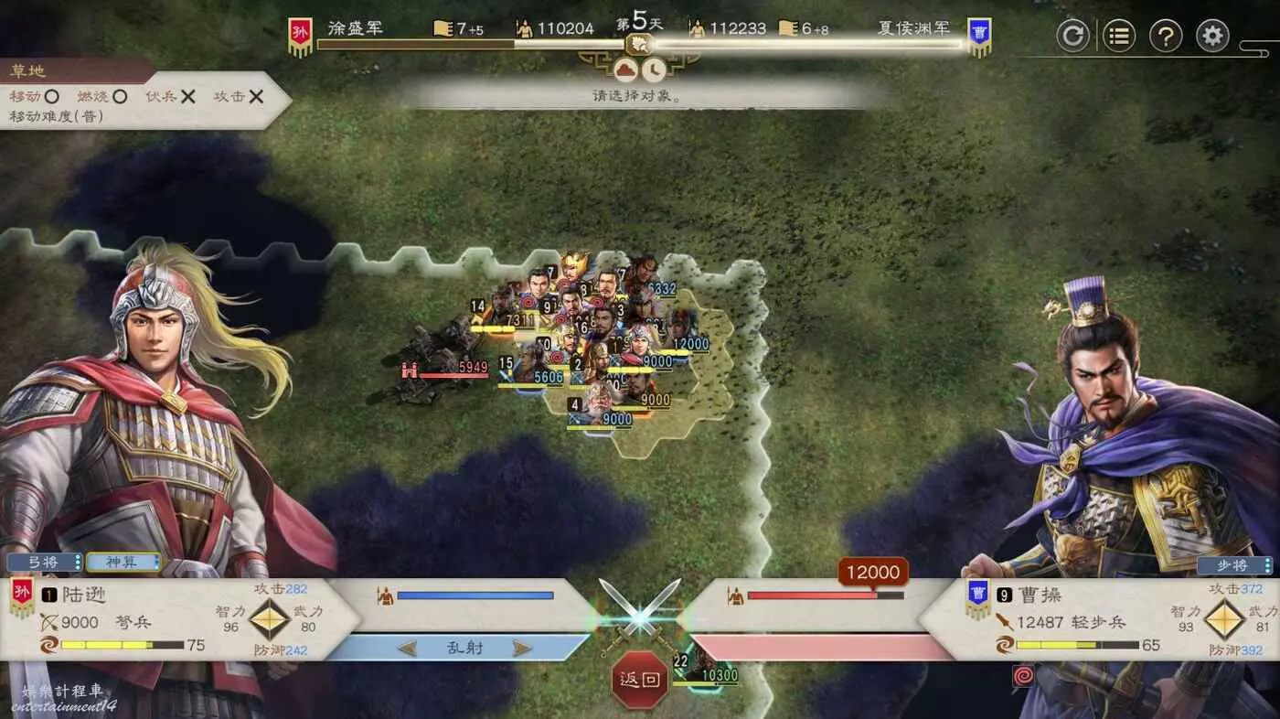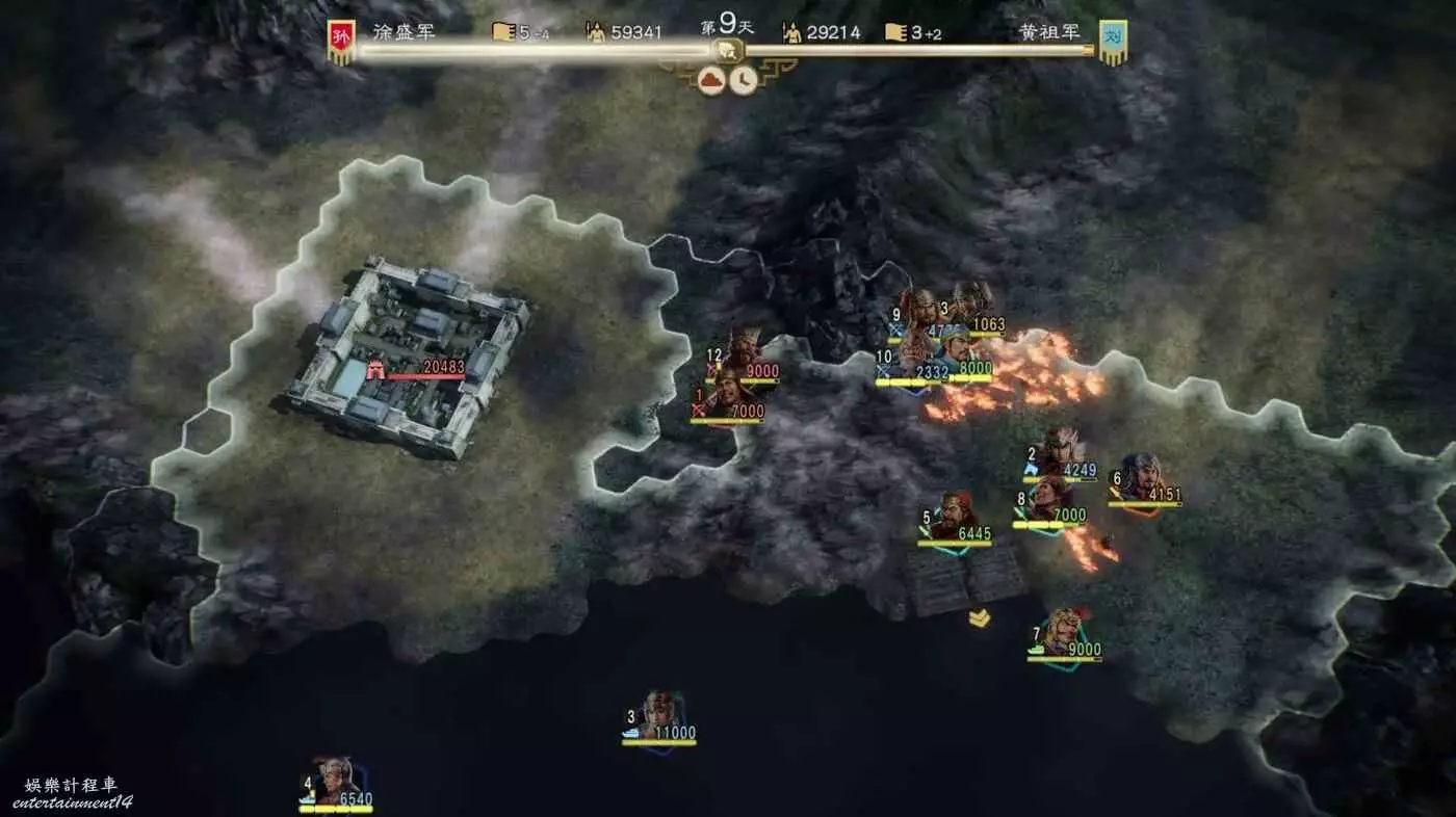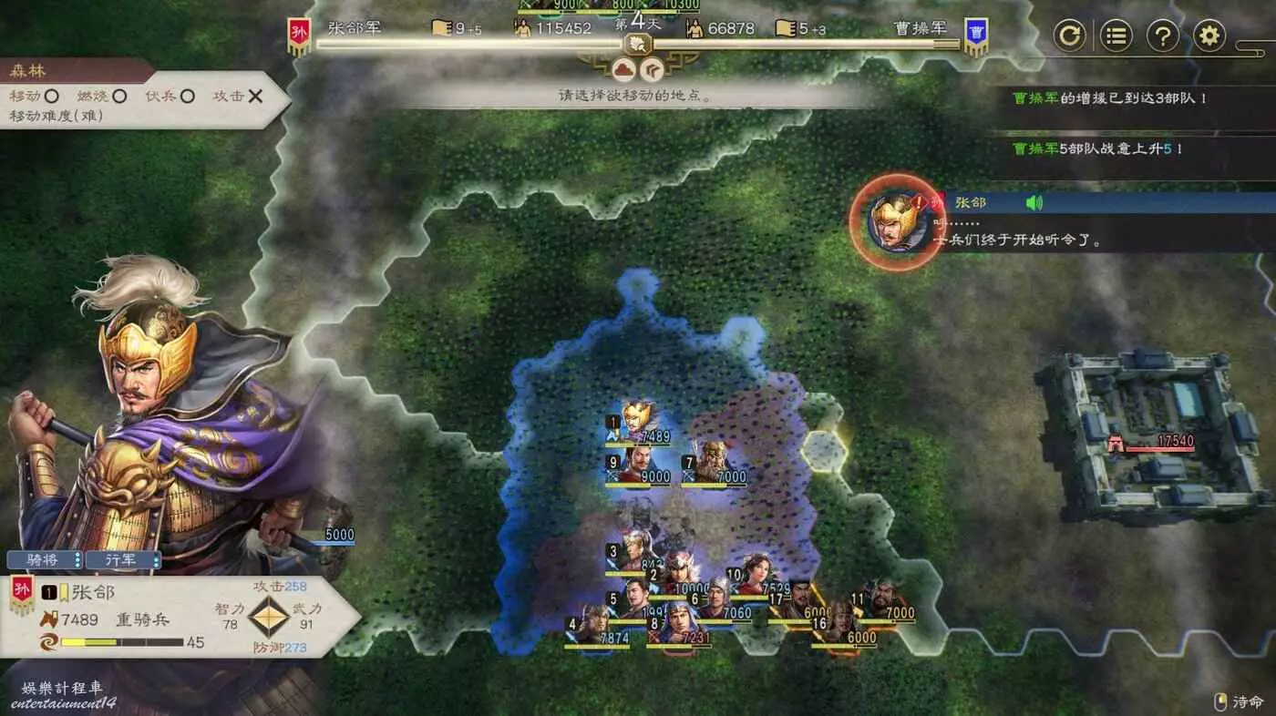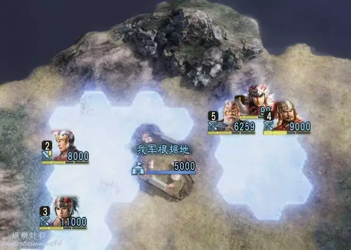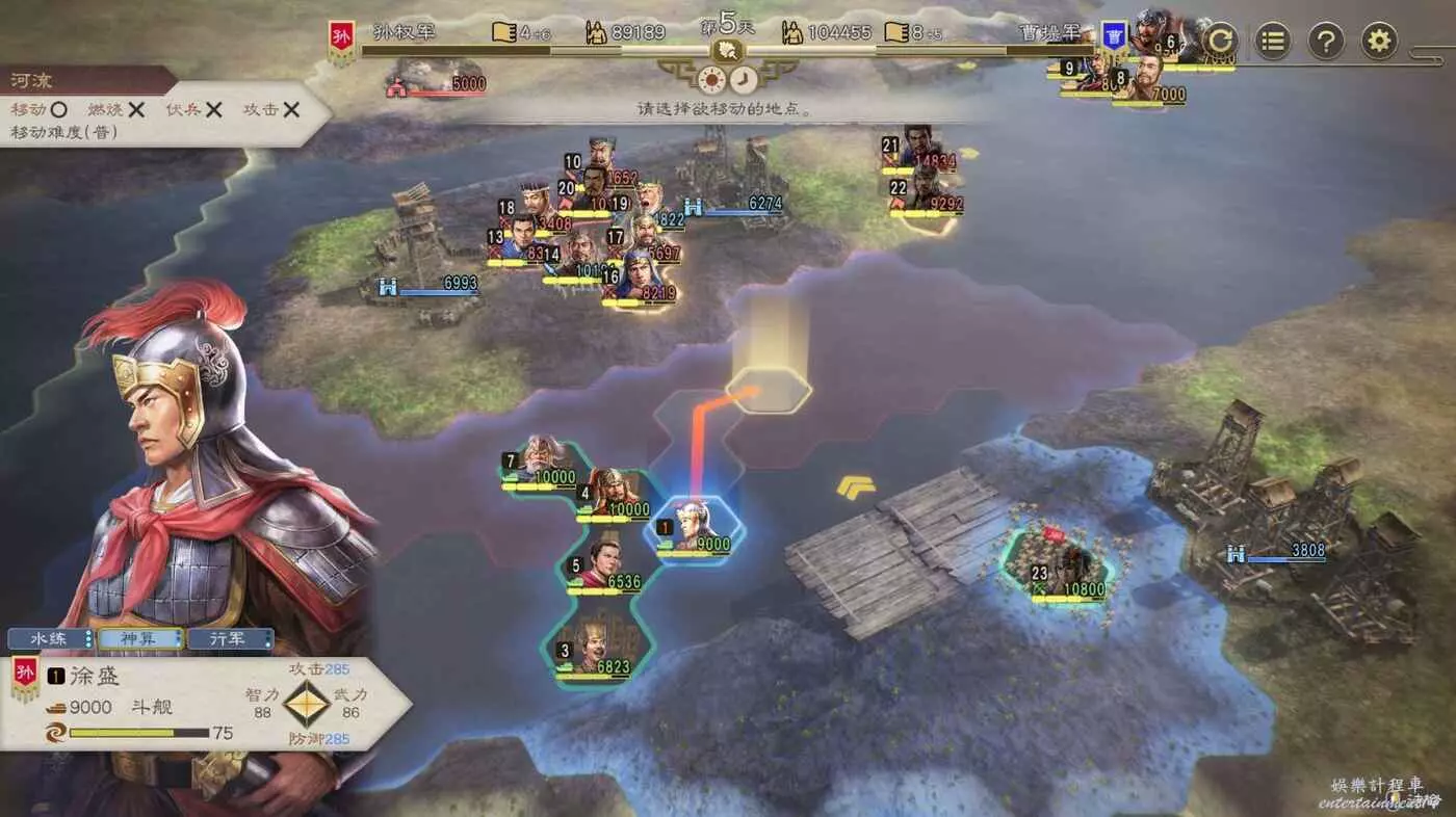 第四天搶下一輪援軍剛到無法攻擊的間隙全力輸出一波,同時要記得不要吸引到左邊城池附近的敵軍,避免腹背受敵(圖中為第5天是因為剛操作完。)
