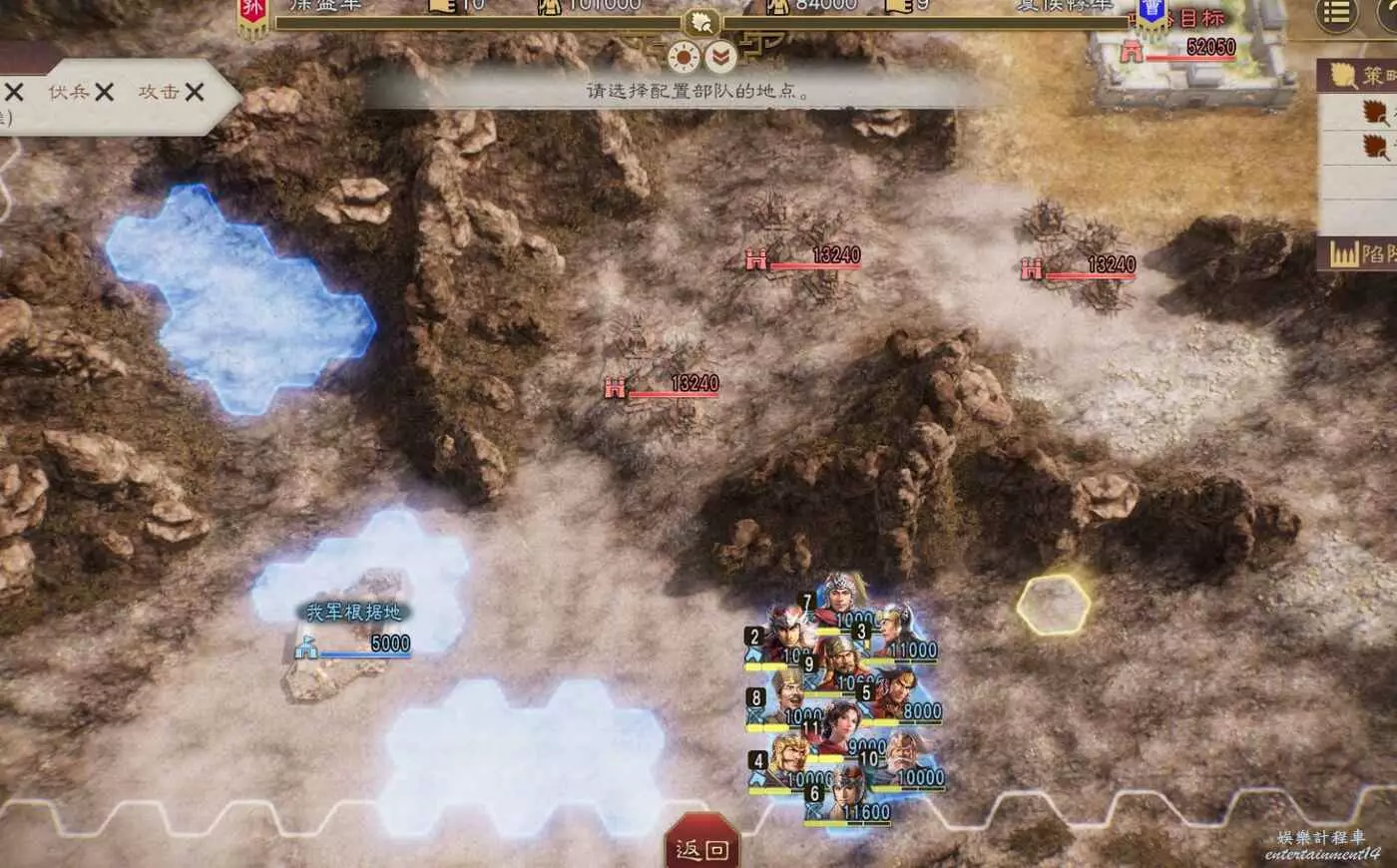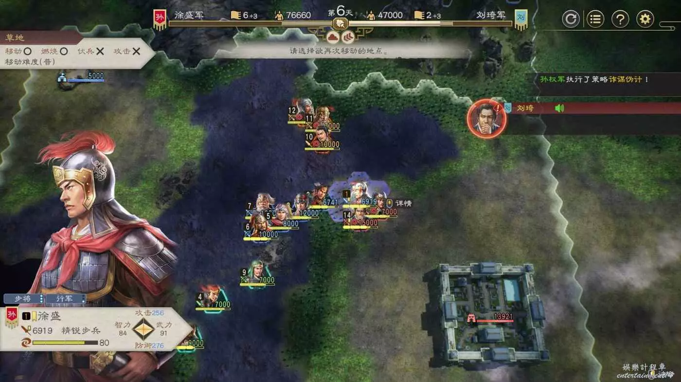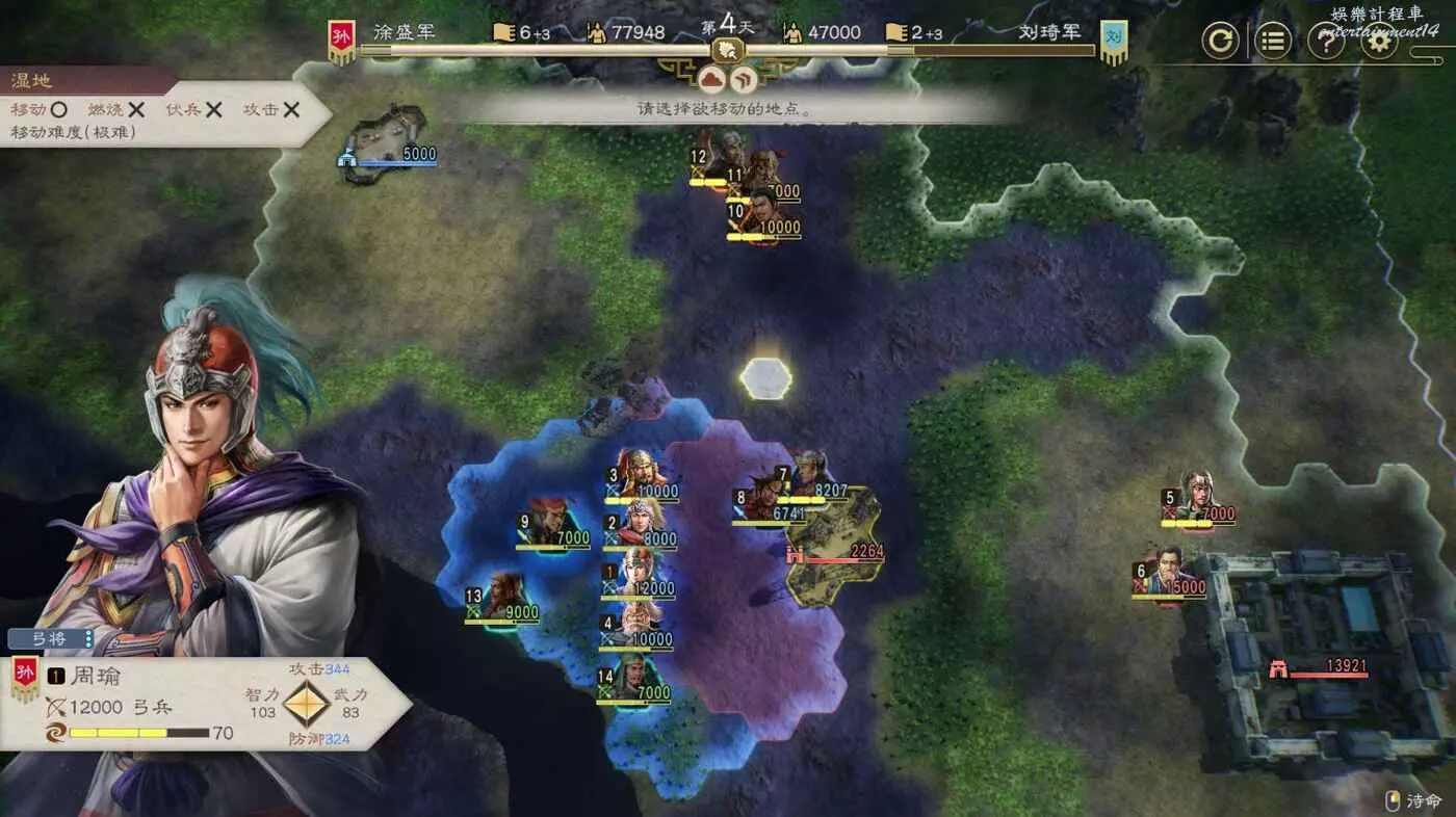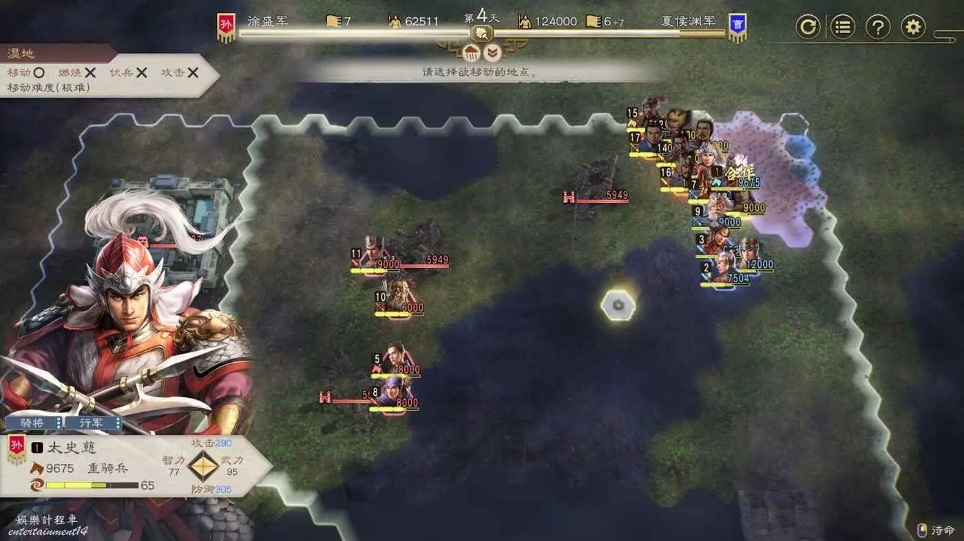 第四天搶下一輪援軍剛到無法攻擊的間隙全力輸出一波,同時要記得不要吸引到左邊城池附近的敵軍,避免腹背受敵(圖中為第5天是因為剛操作完。)