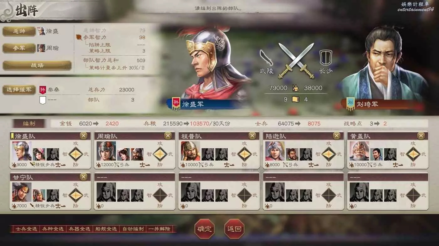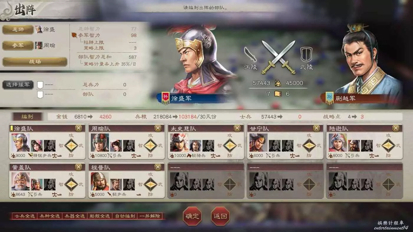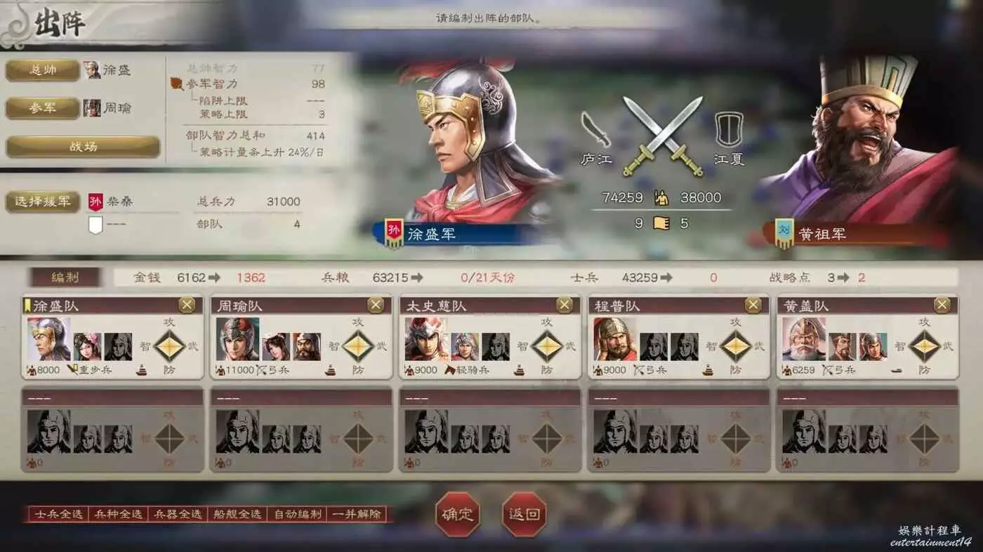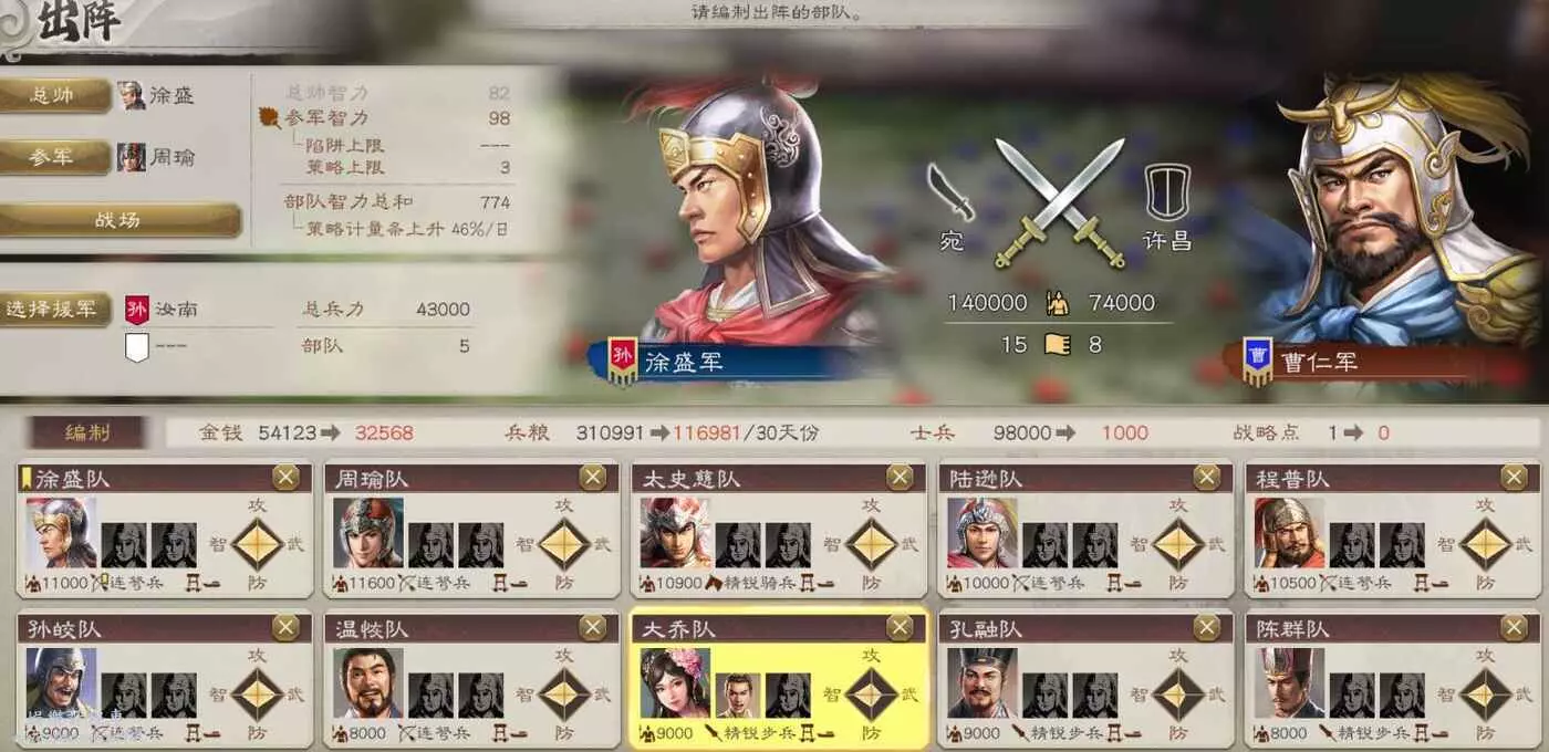 大戰在即,我們兵力不足,不過有柴桑援軍可以幫忙,然後不攜帶任何攻城器械可以少花點錢。