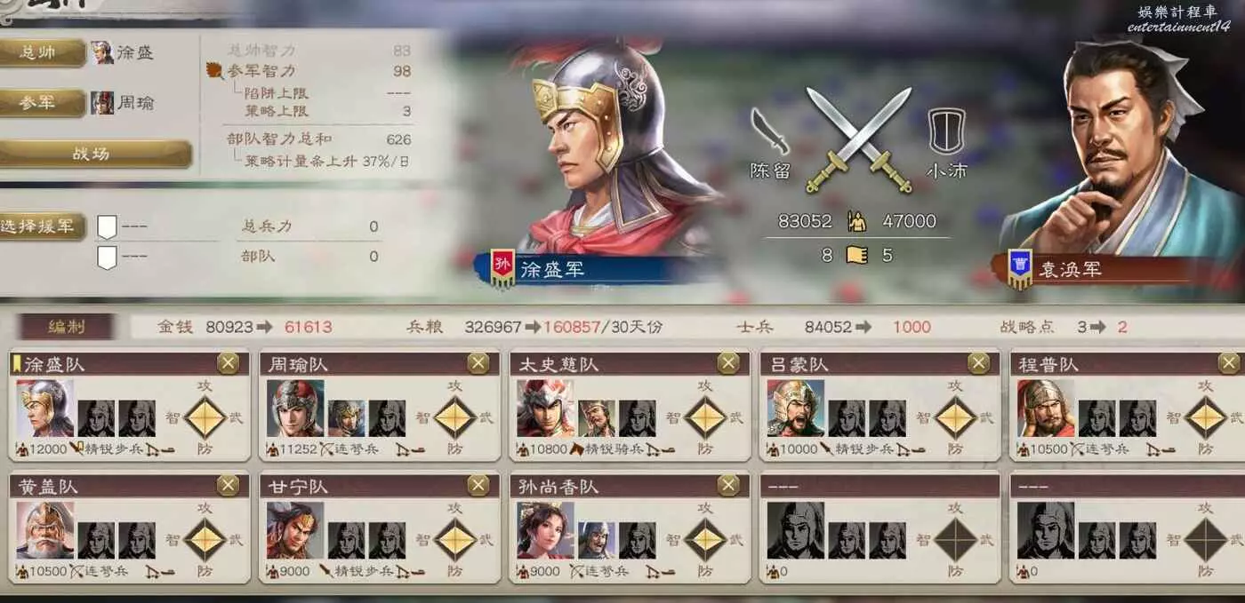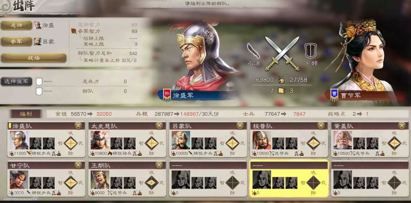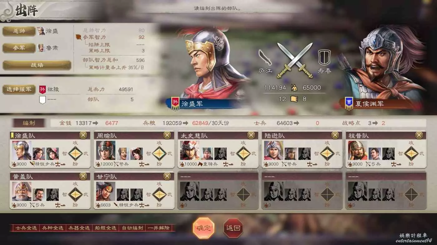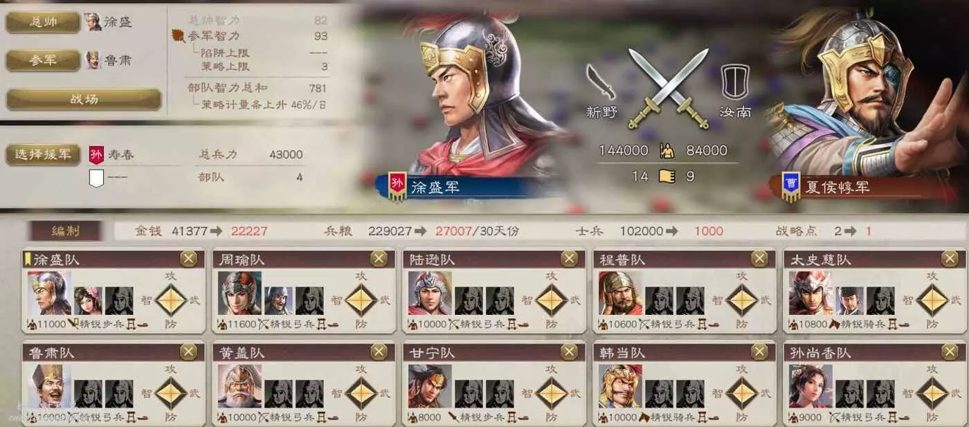 大戰在即,我們兵力不足,不過有柴桑援軍可以幫忙,然後不攜帶任何攻城器械可以少花點錢。