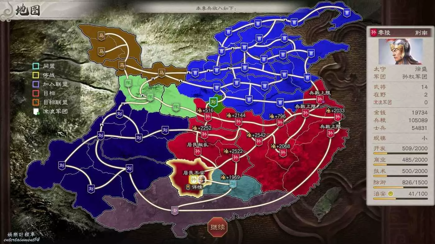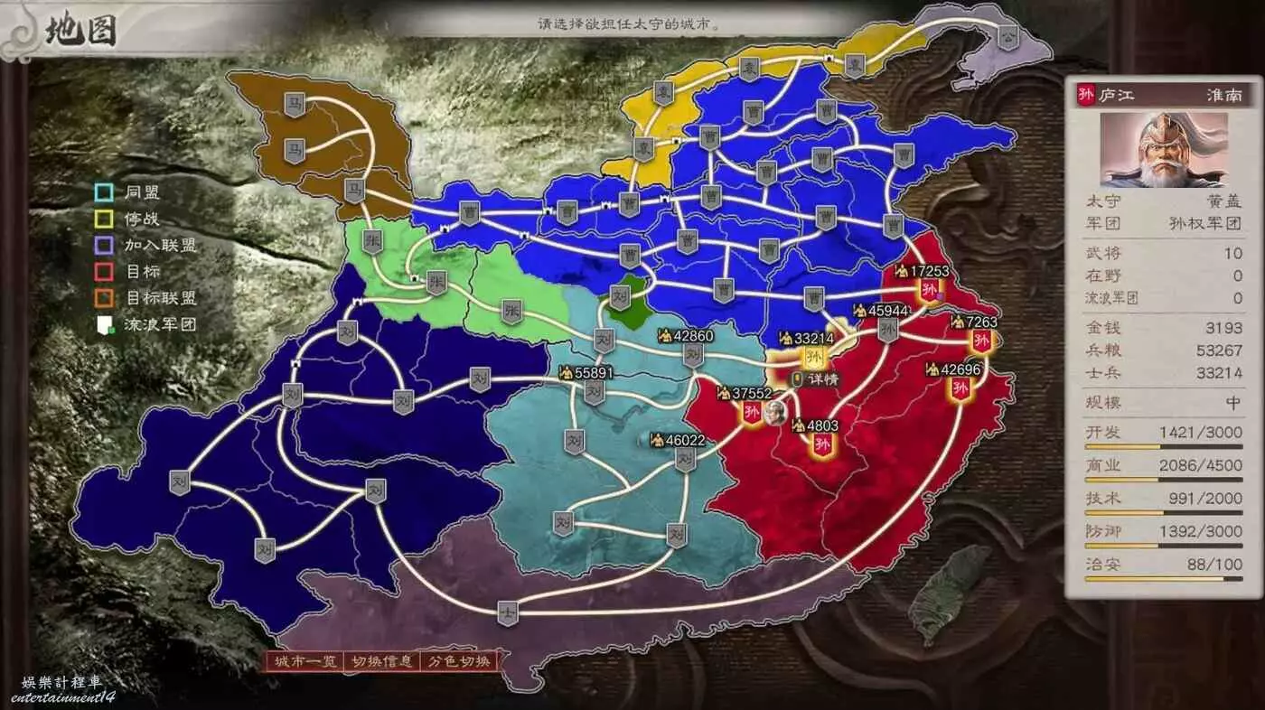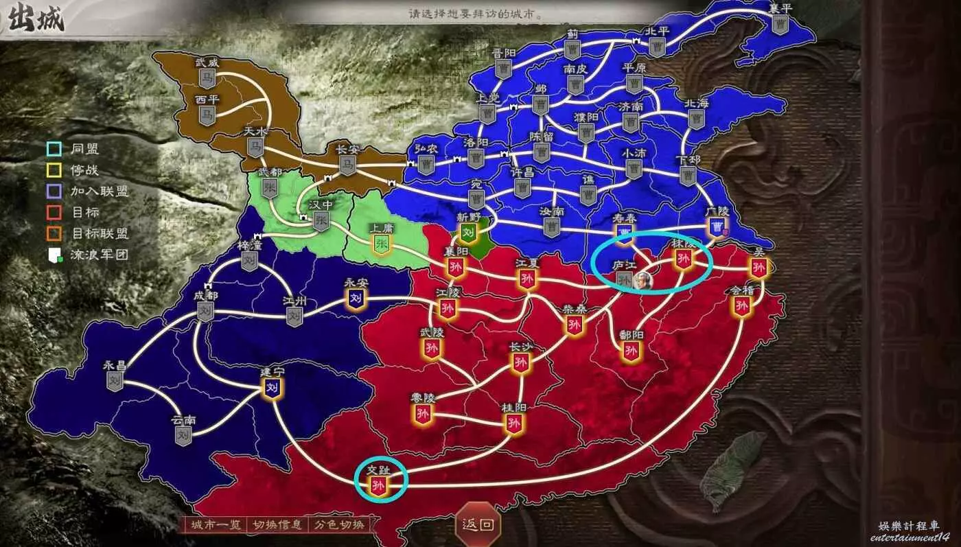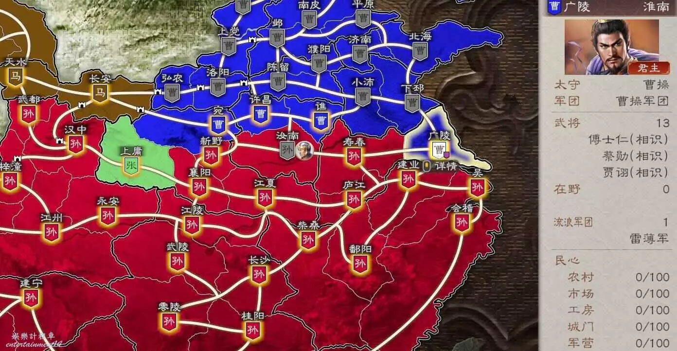正在我計畫推進到拿下馬騰的時候,曹操一直騷擾壽春和廣陵,但是孫權根本扛不住攻勢,必須要我一直調兵過去支援才能不丟城,所以決定暫緩馬騰這邊去給曹操壓力。想奪天下還是沒那麼輕鬆啊。