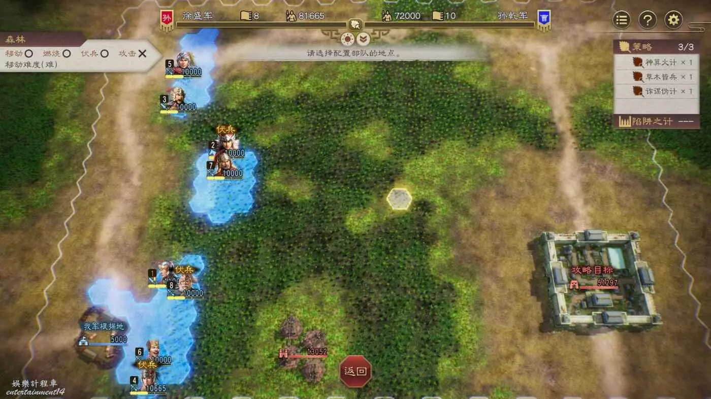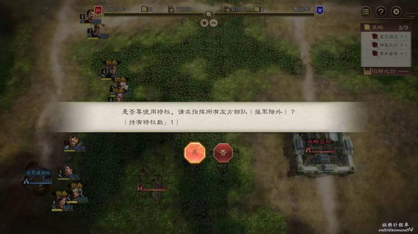我們直接利用特權要求張郃進軍,同時再利用之前攢下的特權搶奪指揮權,然後戰鬥時讓張郃落敗我們直接上任廣陵。可惜沒法調動初始佈陣。
