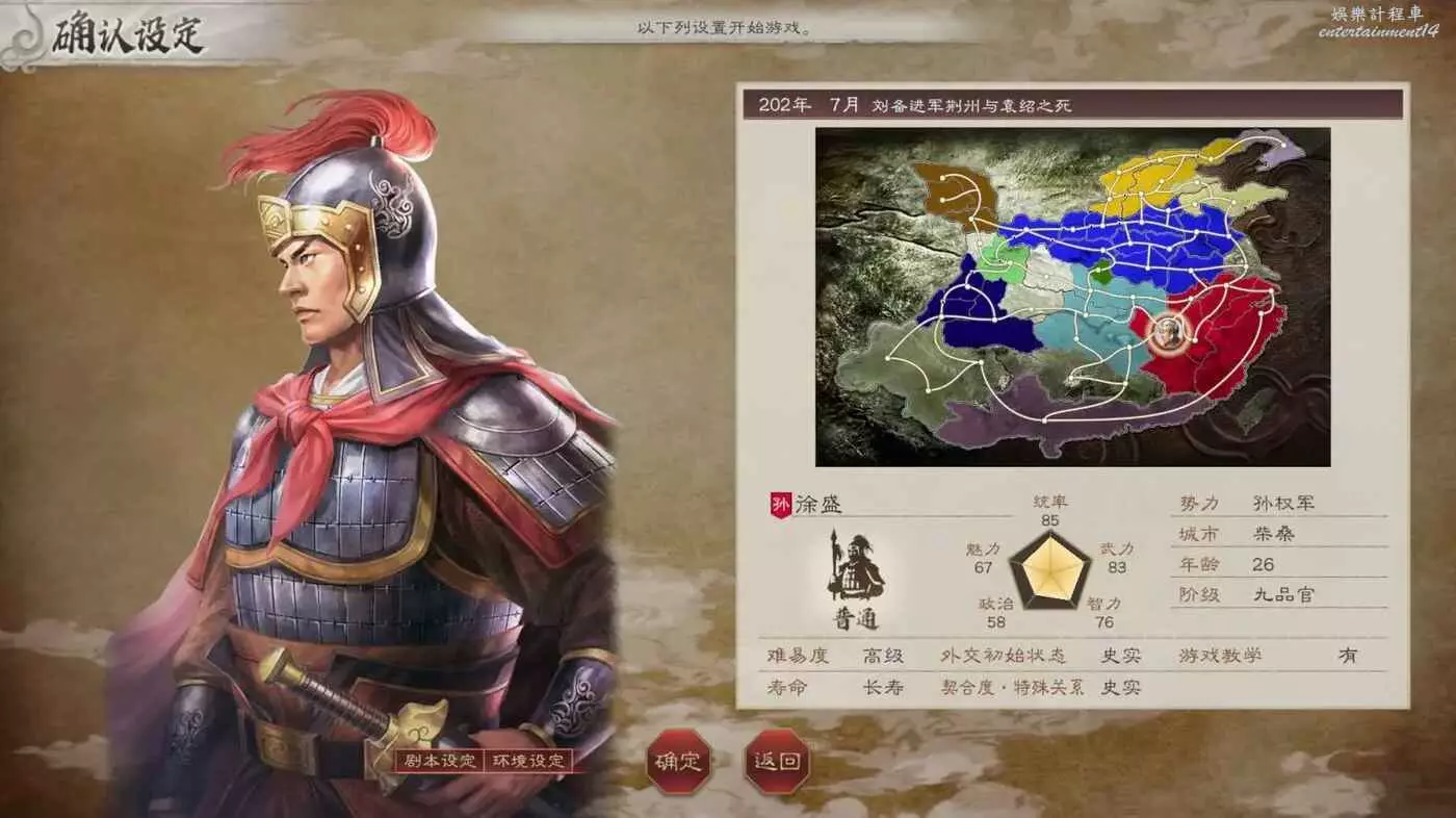 剛進入遊戲便是劉備戰敗後投劉表入駐新野,曹操正在打袁紹的兩個兒子的時間節點,而我們大寶初始在柴桑做一個普通武將。