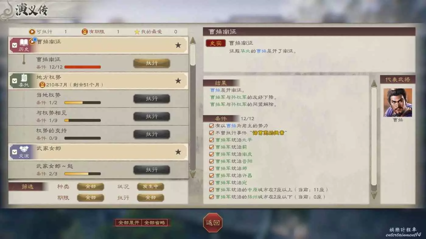 歷經了不到14年的時間,大漢天下已經入手三分之二了,曹操也因為我一波一波的殲滅兵力消耗殆盡,剩下時間比較枯燥,就不再繼續水了,結檔的時間點,我們已經達成了3個結局(可惜只取了兩個老婆,還有個空位),本文也到此完結,感謝大家的觀看,最後放幾張進度相關的圖吧。