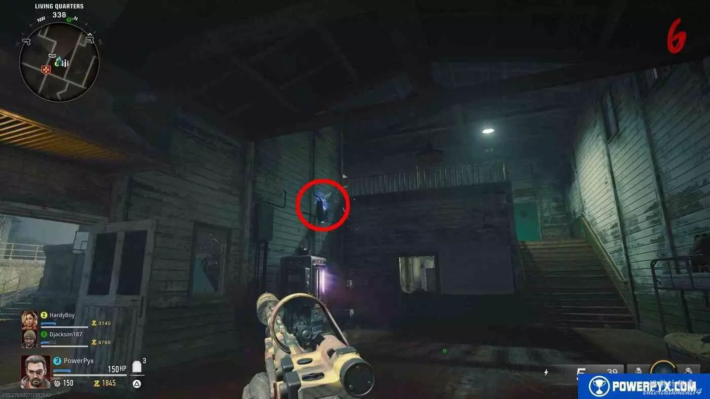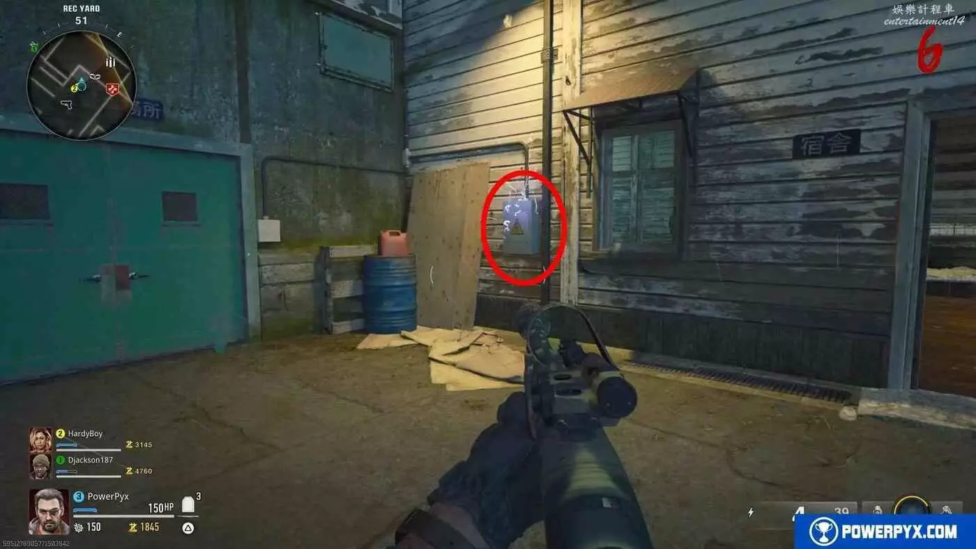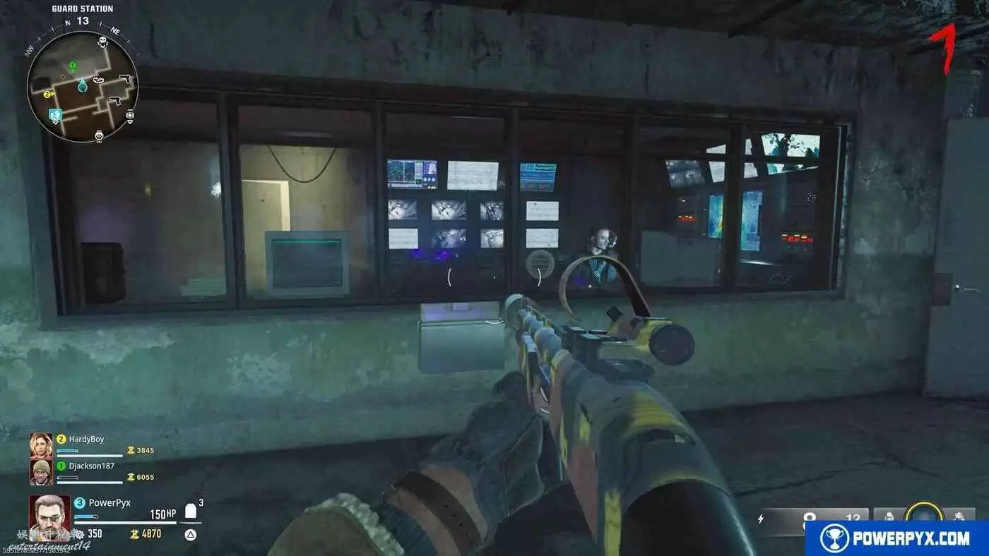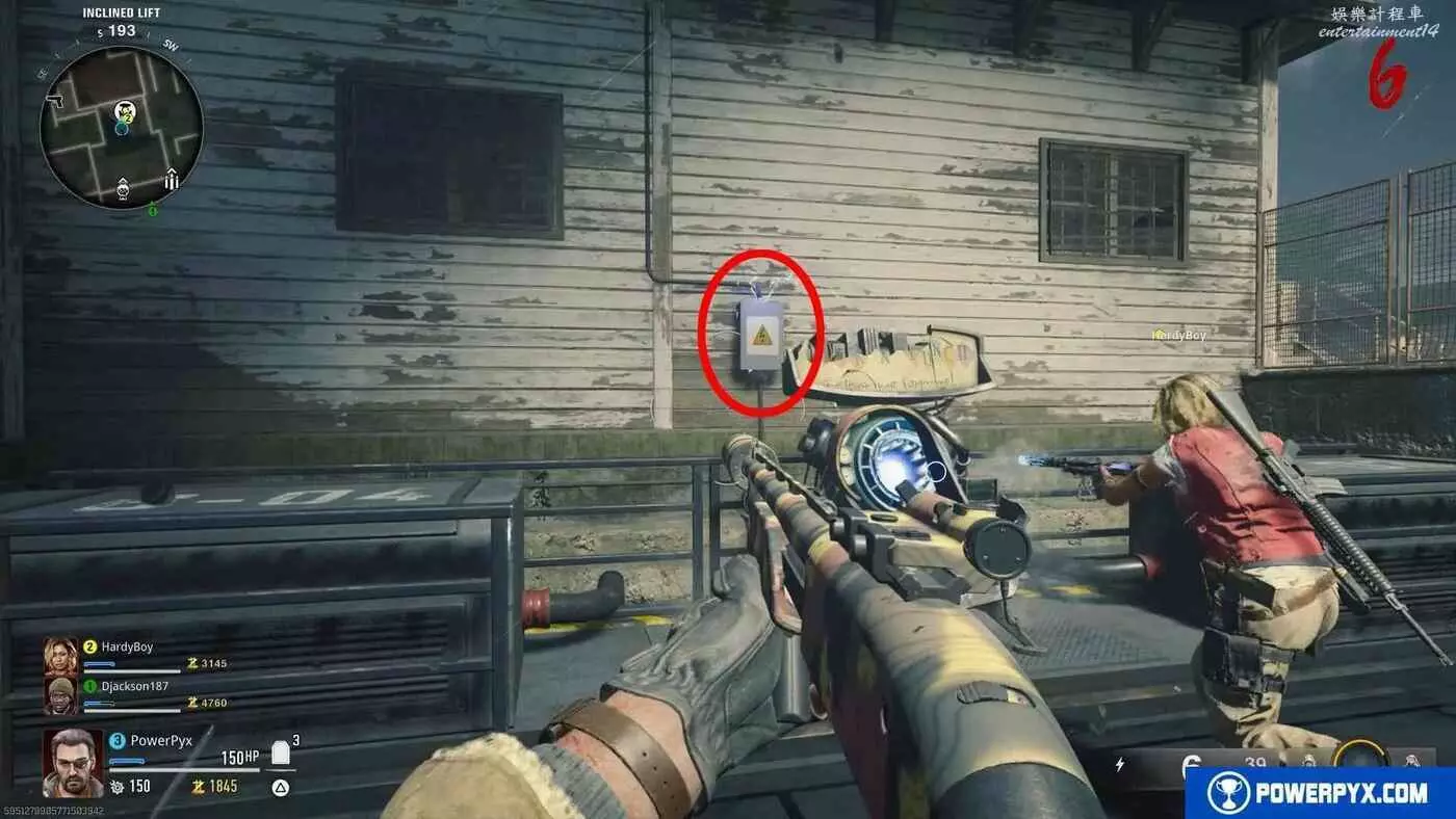 【電箱2位置】射擊第一個電箱後,立即向右旋轉90°,射擊牆上的第二個電箱,一定要在電梯經過之前迅速命中。