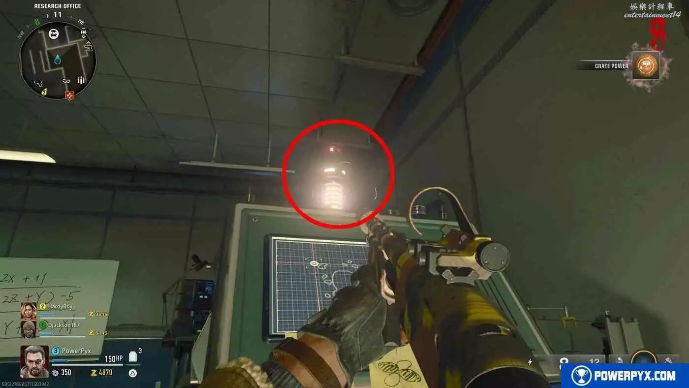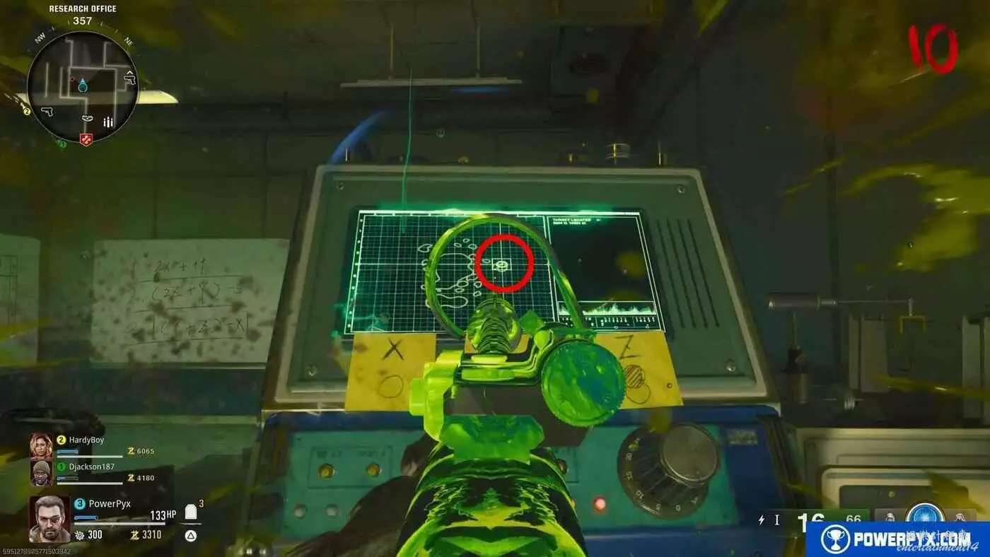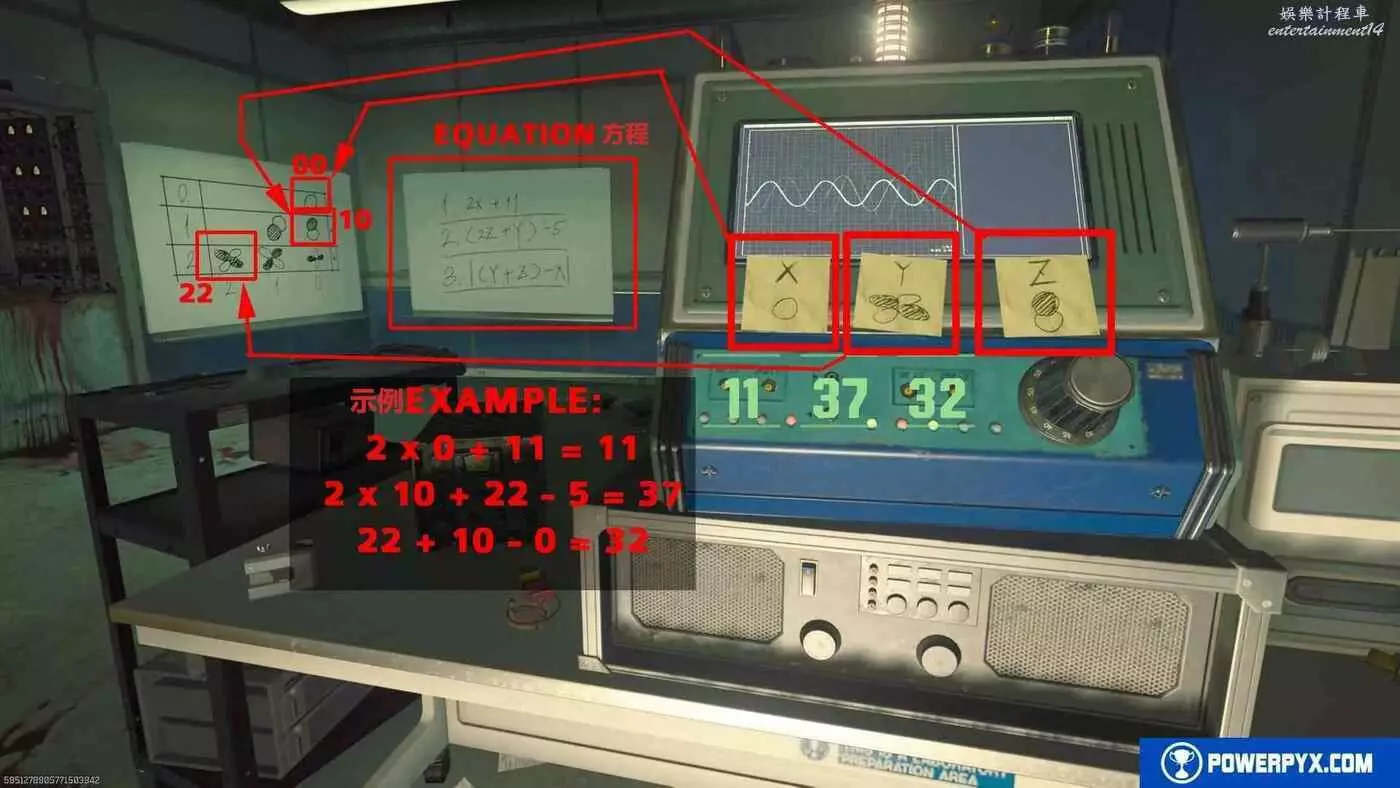 返回初始區域安保室,與玻璃後的博士交談付給他5000貨幣讓他解開方程,雖然很容易但會浪費點數,這些點數最好用來為最終BOSS做準備,但如果是單人遊玩,沒有隊友幫忙分擔清喪屍的壓力的話,此方法會簡單很多。