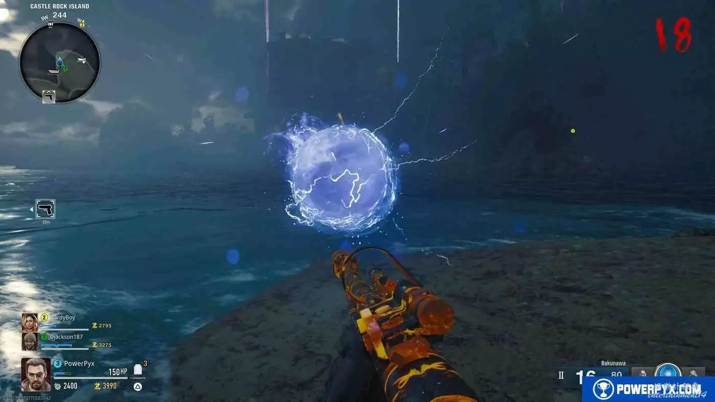 【奇跡武器部件1位置】到達標記島嶼後,可以看到一個藍色球體,按住□鍵/X鍵將多相位共振器放在地上與它互動,出現喪屍,清掉喪屍,有些會掉落藍色小球,拾取小球並放到大的藍球上,重複兩次。然後藍色球體就會飛走,注意看它前往的方向,它會飛到下一個島上,拾取多相位共振器。