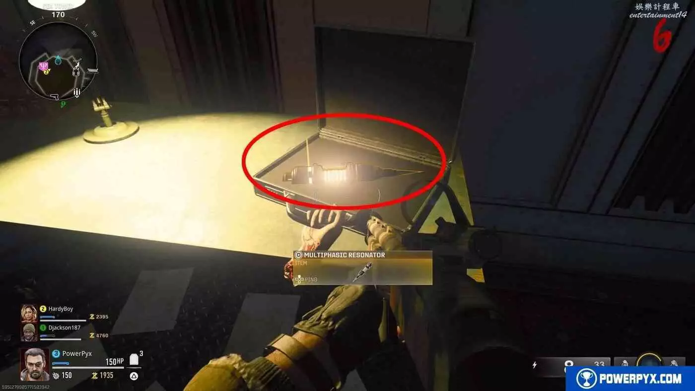就在輸入數位密碼的電腦上方,有一個發光的燈,這個就是【多相位共振器】,取走它,然後查看螢幕,螢幕上會標記出需要前往的小島(目前似乎全部都是在地圖東側,後續版本不清楚是否會更換為隨機位置),在戰術地圖標記它,從碼頭乘船前往小島進行下一步。