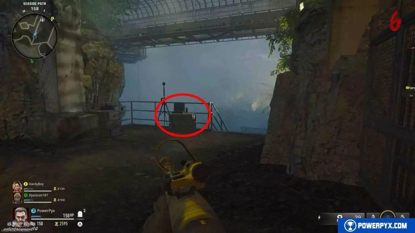 ③【電腦3位置】在通往碼頭的樓梯頂端,從【步驟3】中打開公事包的塔的位置往碼頭方向走就能看到這台電腦,就在通往第三個發電機的洞穴外面。